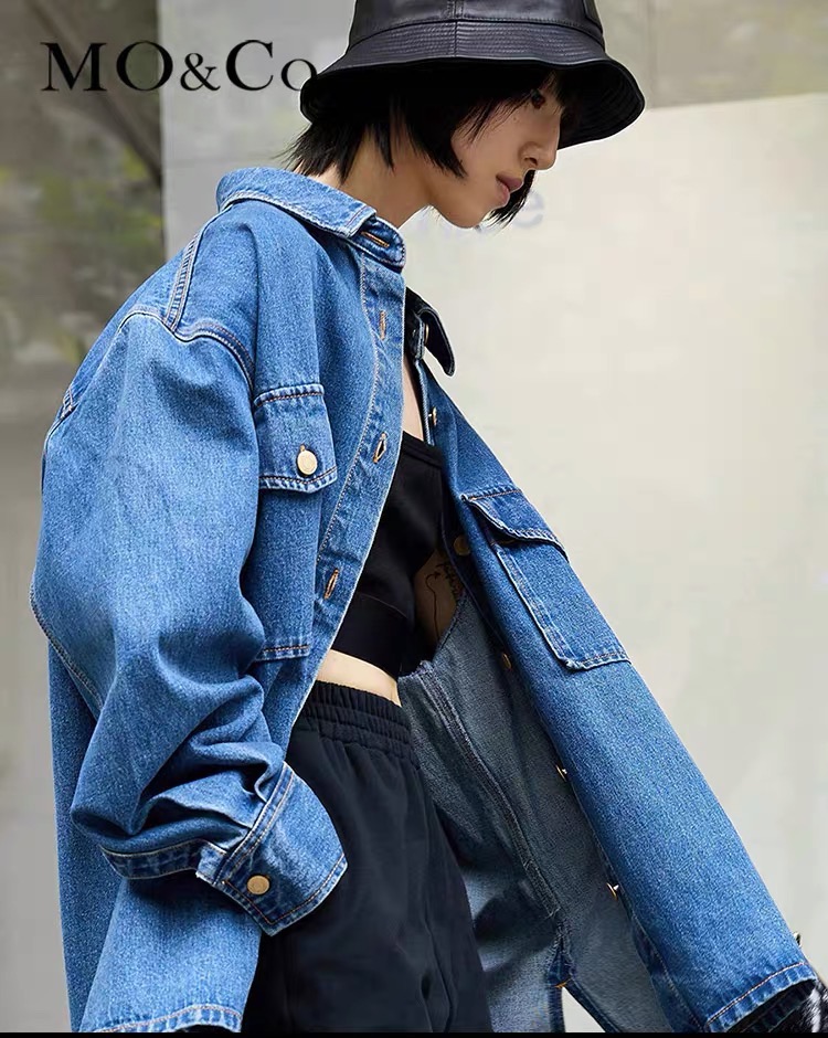 MOCO秋装新款小美人鱼印花宽松衬衫式牛仔外套