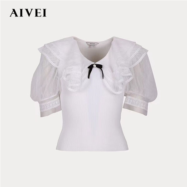AIVEI2022夏款新品透视性感短款法式浪漫针织蕾丝荷叶边上衣