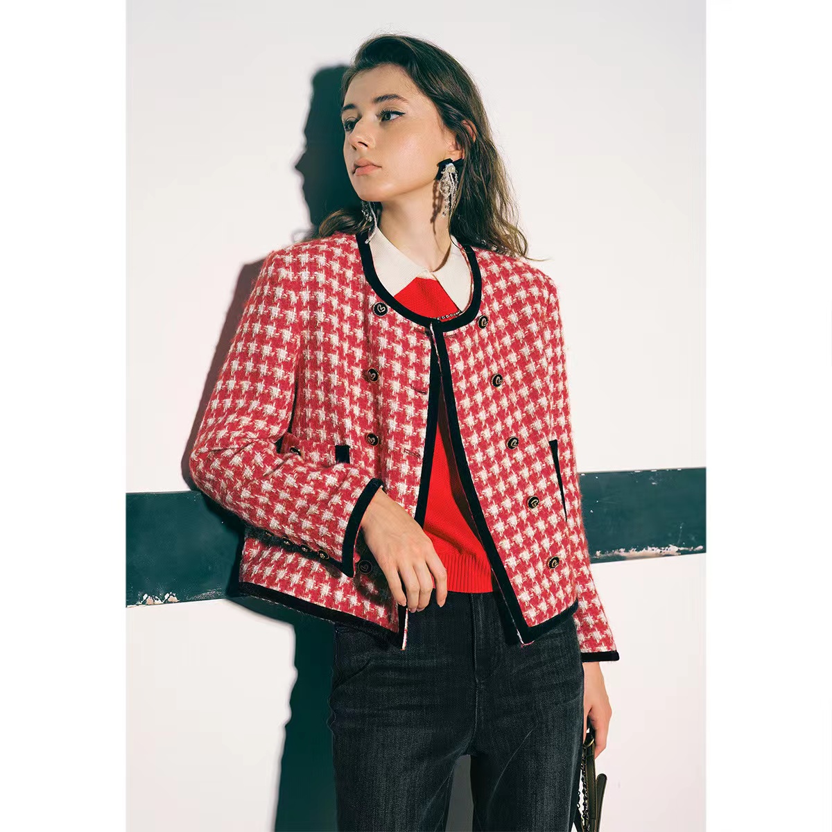 诗篇女装新款宽松圆领千鸟格学院小香风羊毛短外套