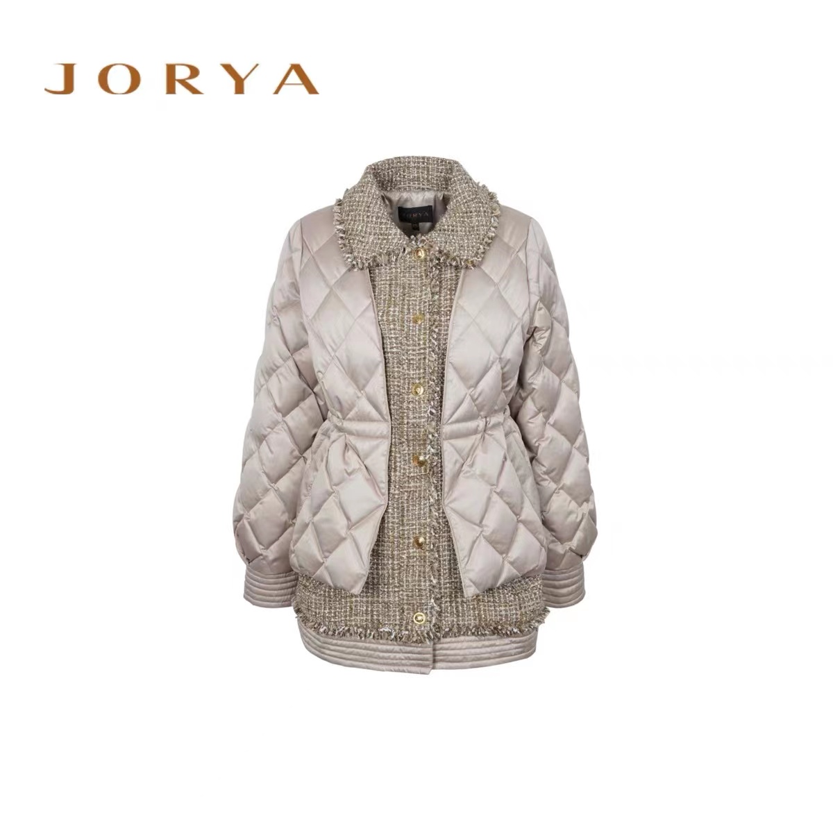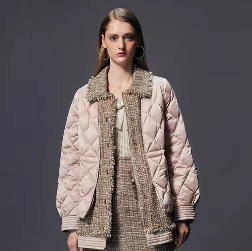 卓雅2022秋冬新款粗花呢翻领拼接菱格长袖单排扣羽绒服O141905D