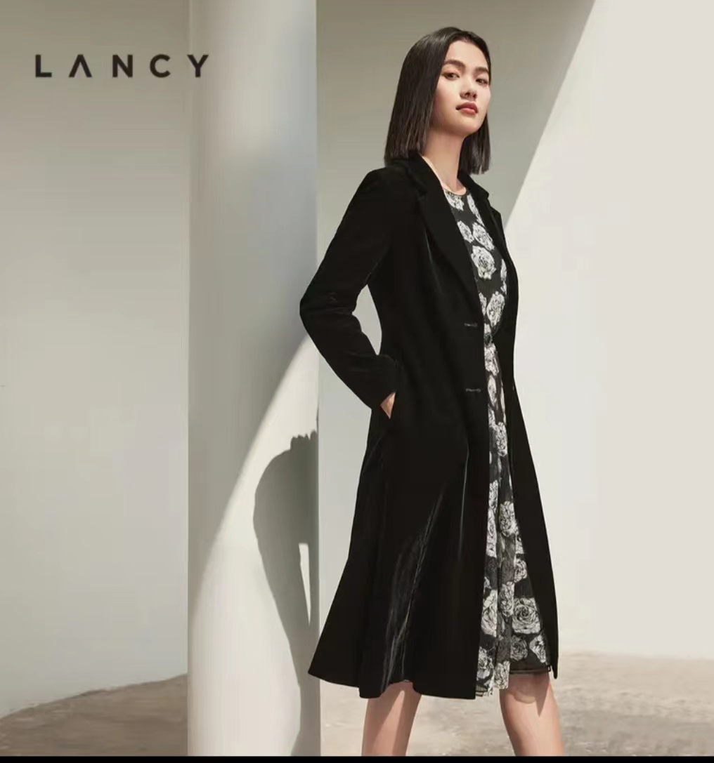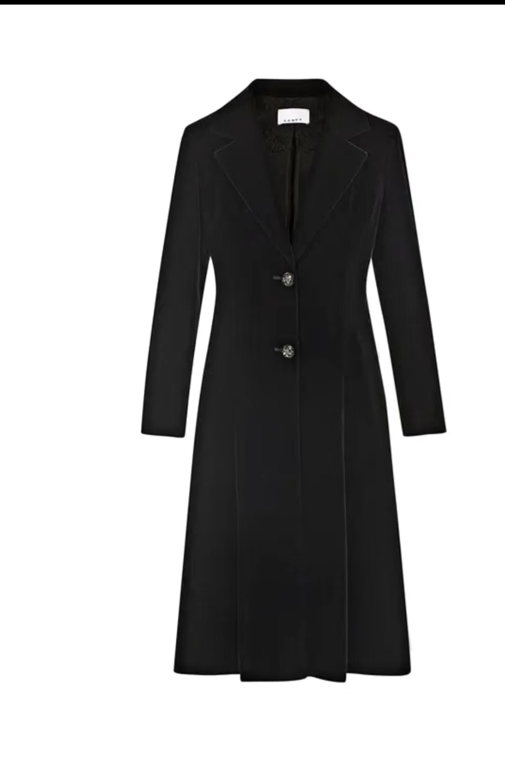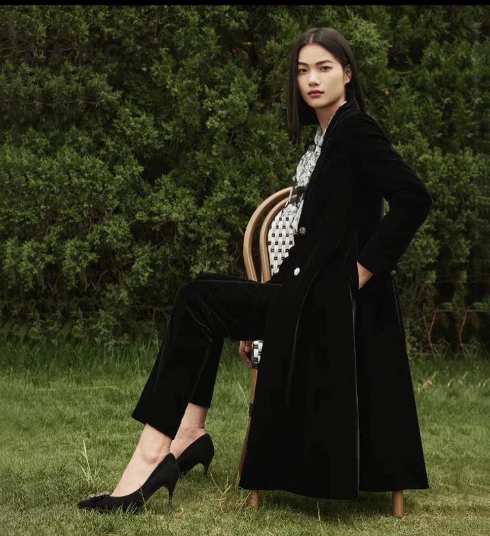 朗姿服饰中长款丝绒黑色复古丝滑大衣