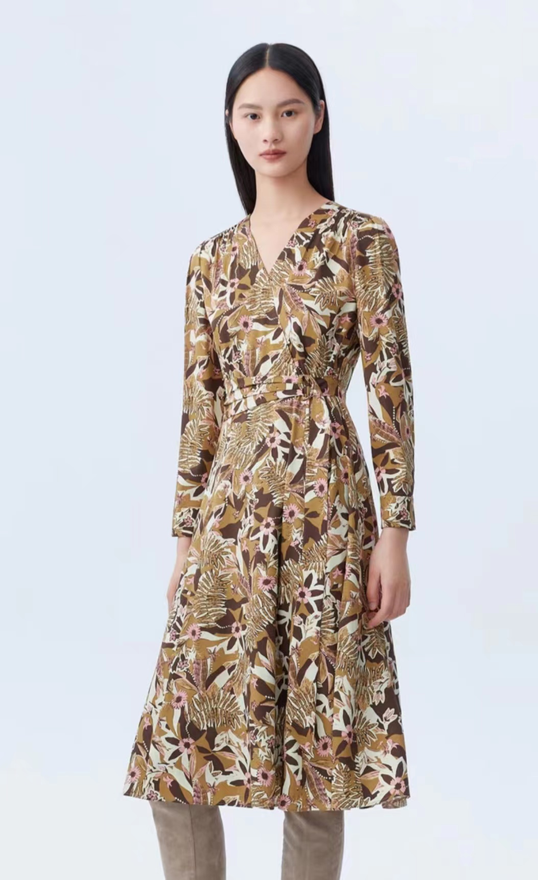 朗姿服饰朗姿气质v领植物印花中长款多巴胺连衣裙