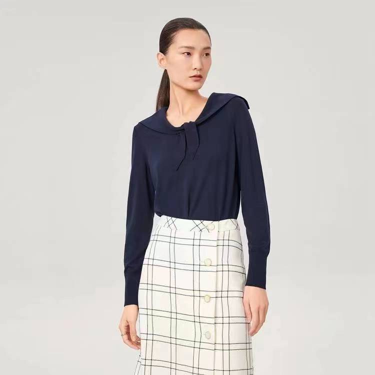 OVV秋冬热卖海军领飘带装饰长袖高支羊毛针织衫