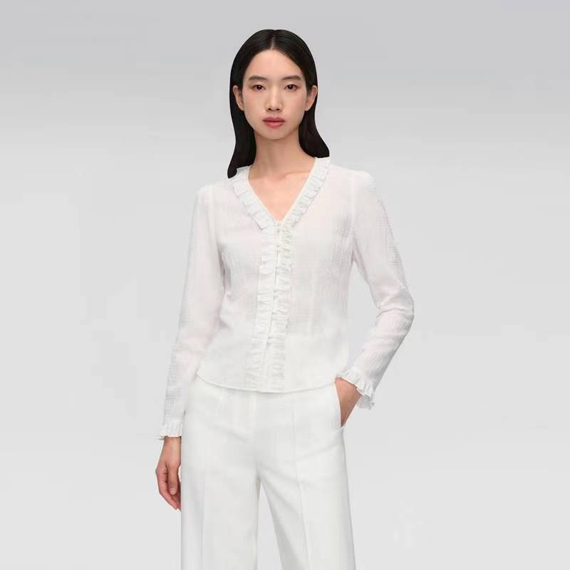 OVV弹力丝绵混纺花边V领泡泡肌理长袖衬衫