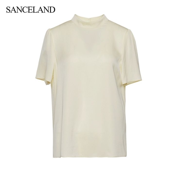 SANCELAND三石一澜夏双乔真丝小衫纯色立领短袖上衣SI21201026