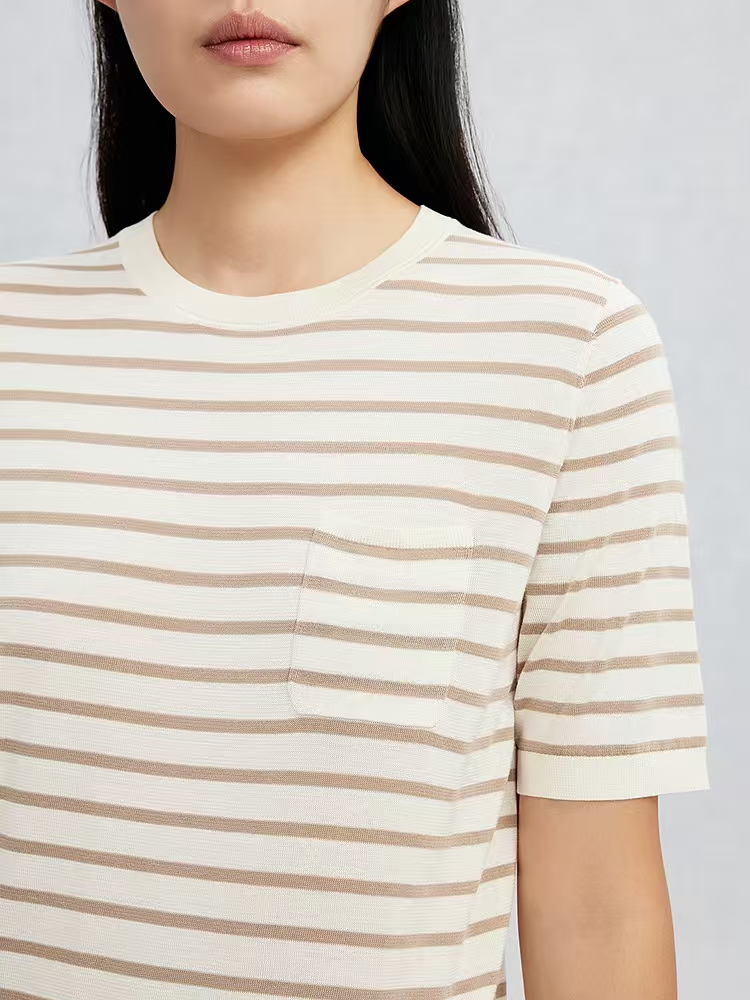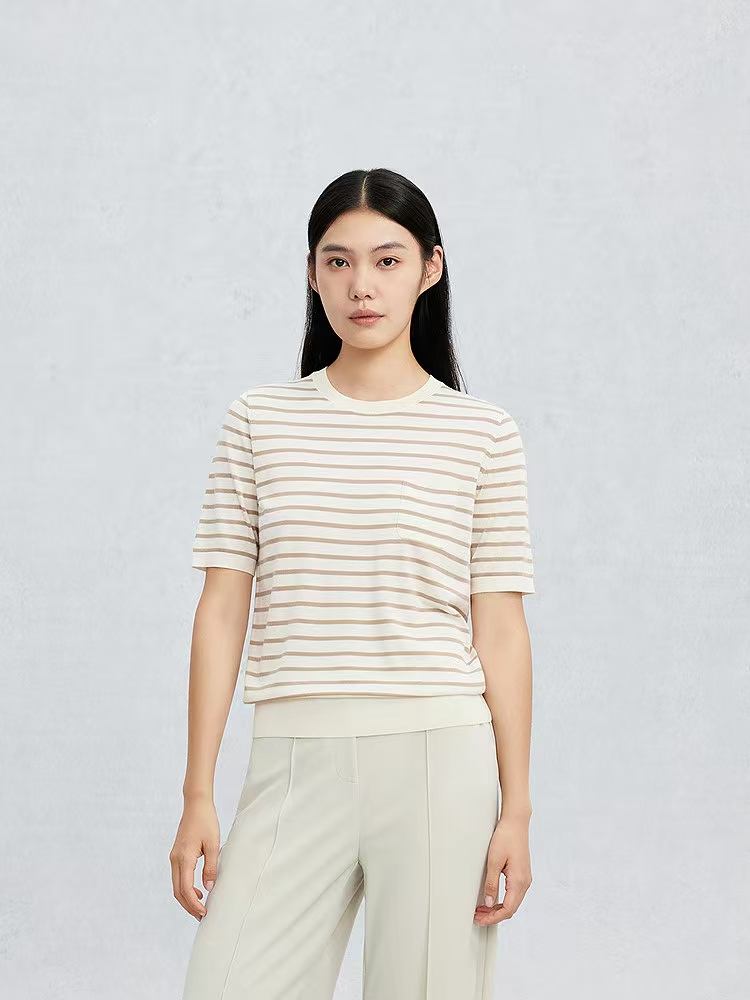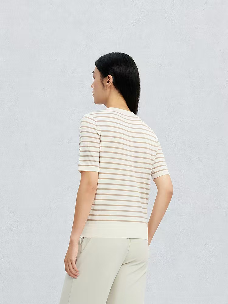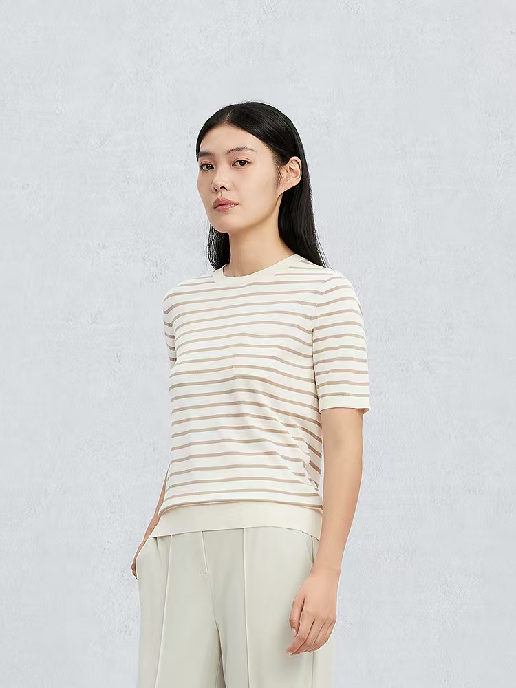 鄂尔多斯1980精纺圆领夹条半袖女套衫
