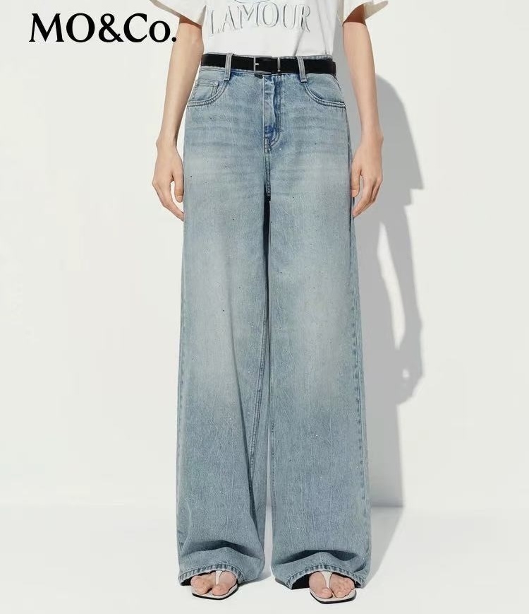 MO&CO新品汉麻棉质烫钻及地直筒牛仔裤