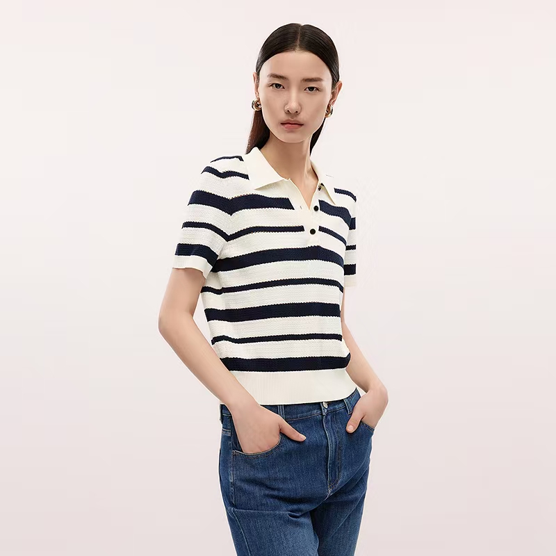朗姿夏款短袖针织撞色POLO领气质上衣