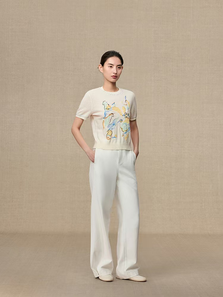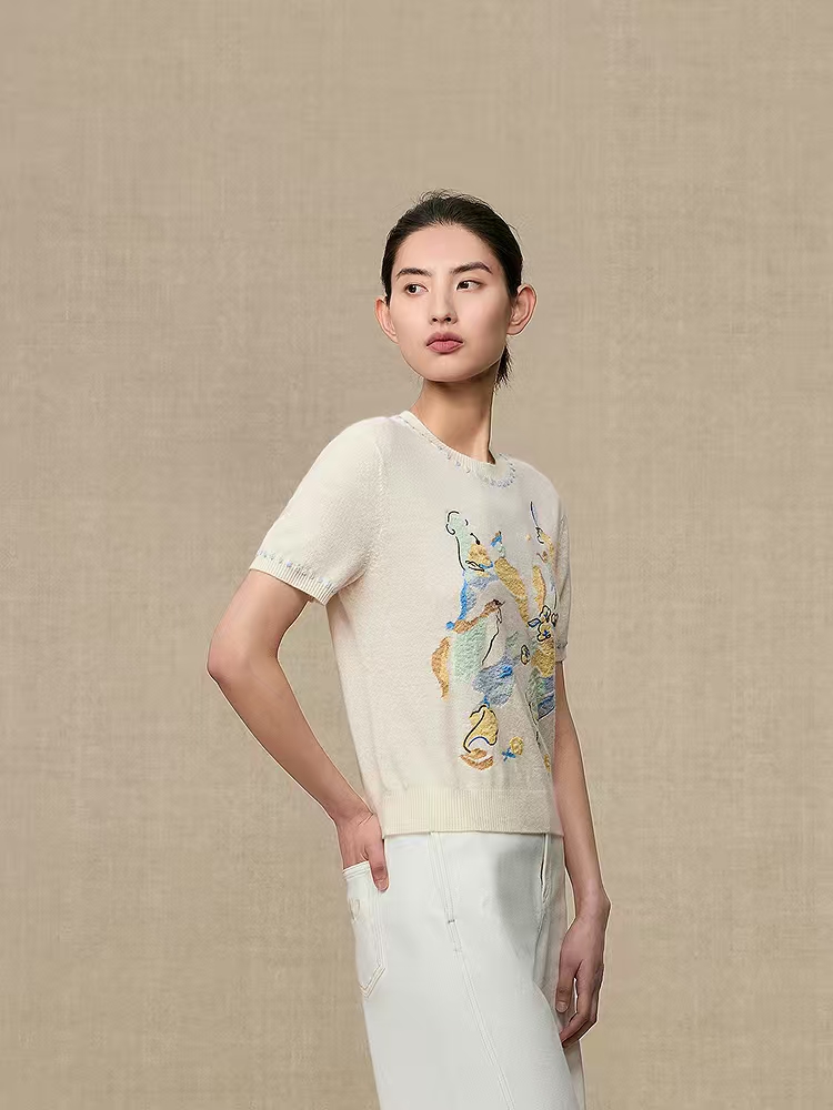 鄂尔多斯1980圆领嵌花半袖女套衫