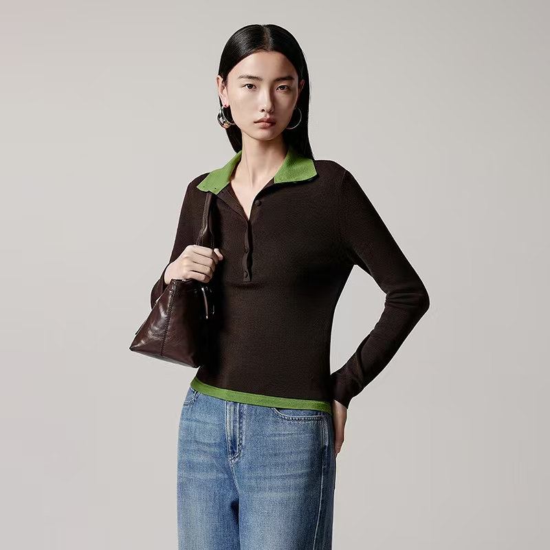 朗姿25年秋新款撞色拼接翻领长袖针织衫
