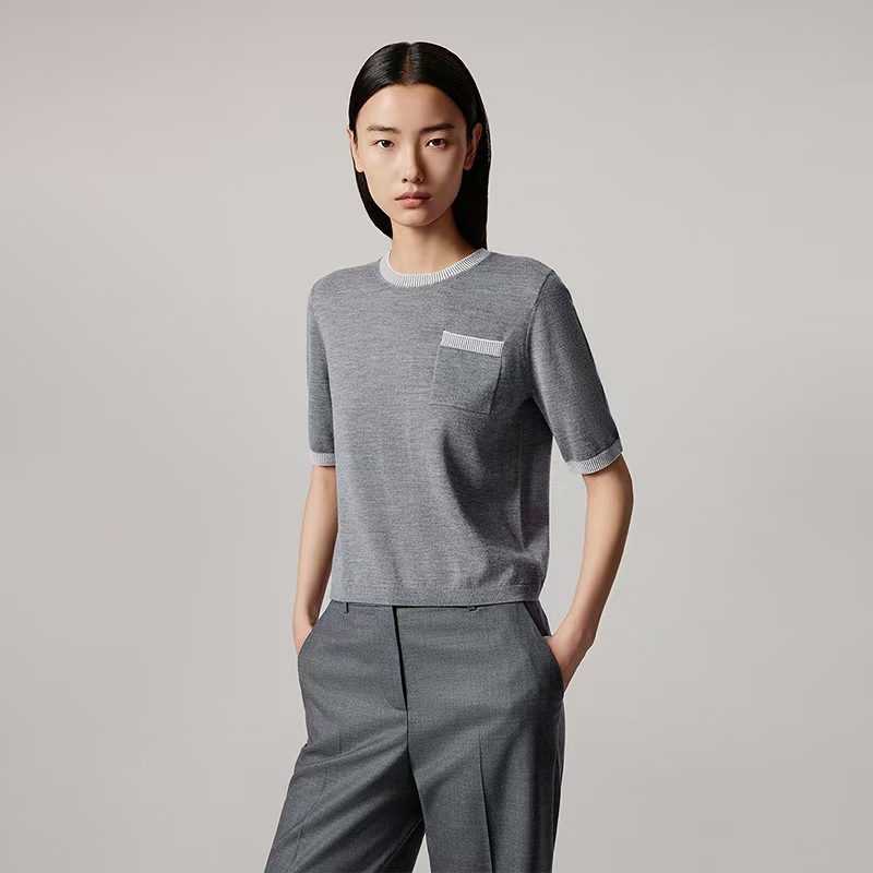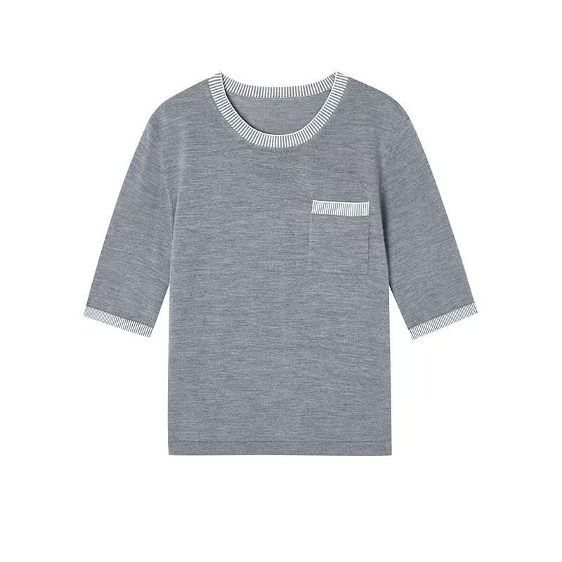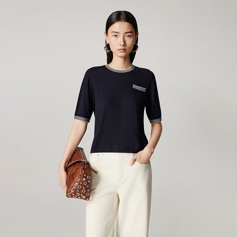 朗姿服饰25年秋新款百搭撞色圆领短袖毛针织衫
