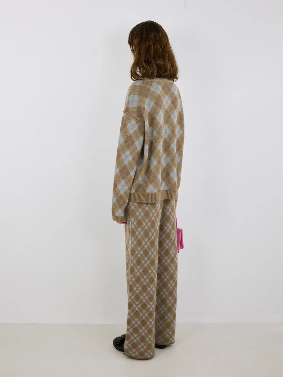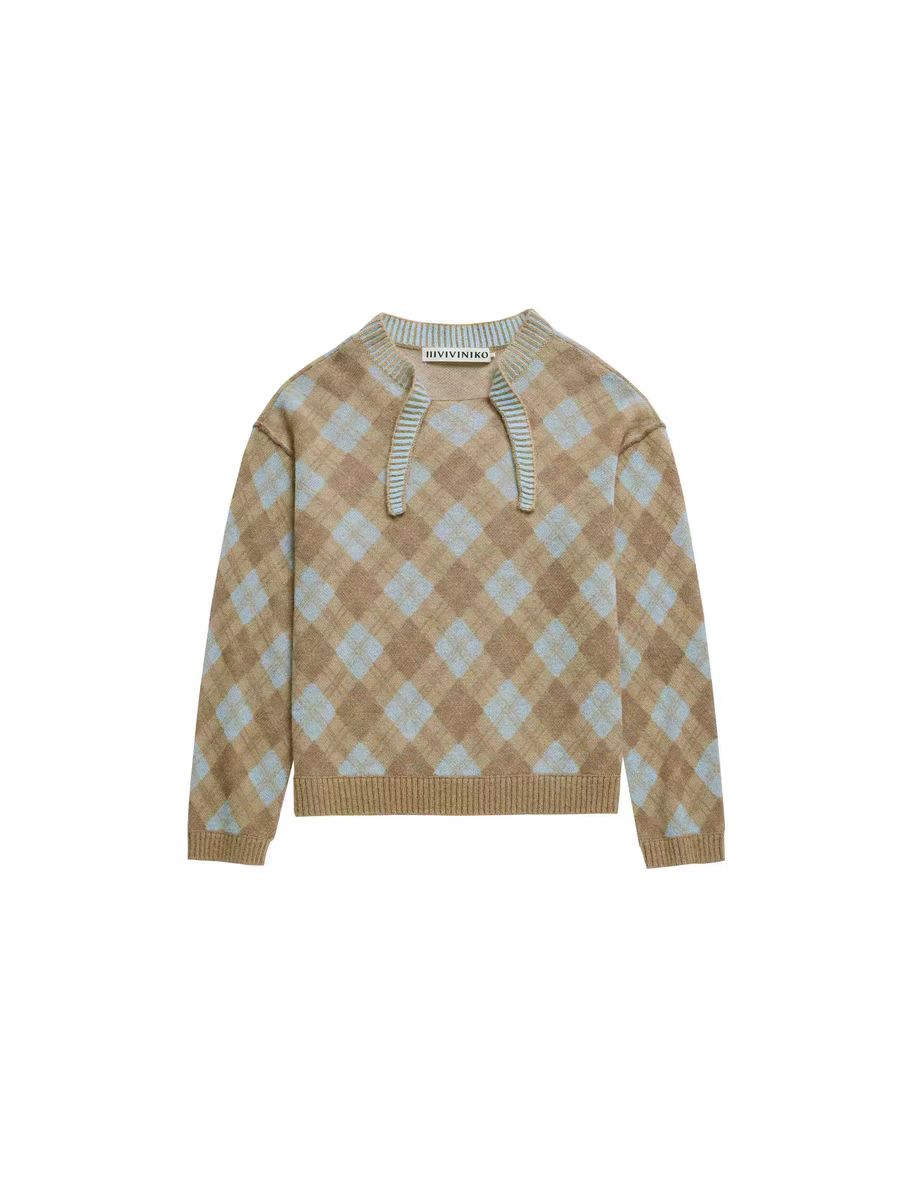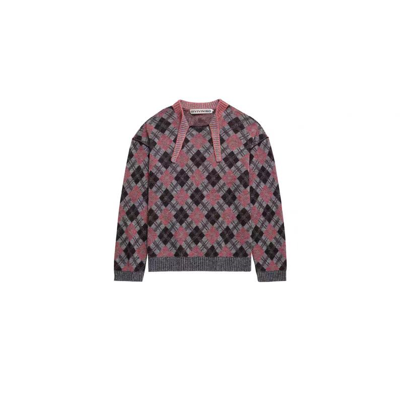 薇薏蔻IIIVIVINIKO2025冬新款复古温柔双色菱格纹针织衫