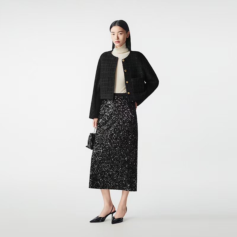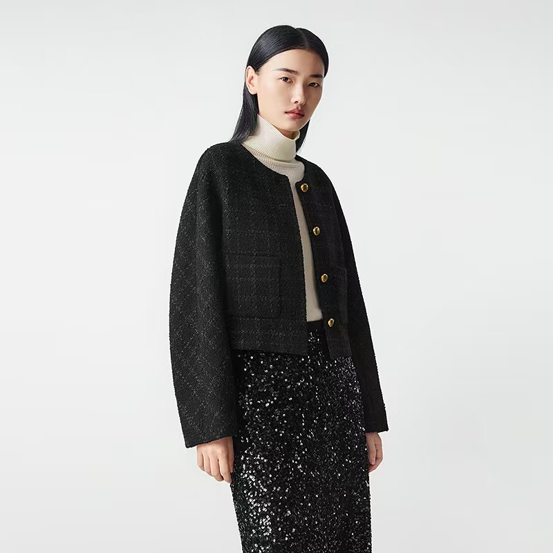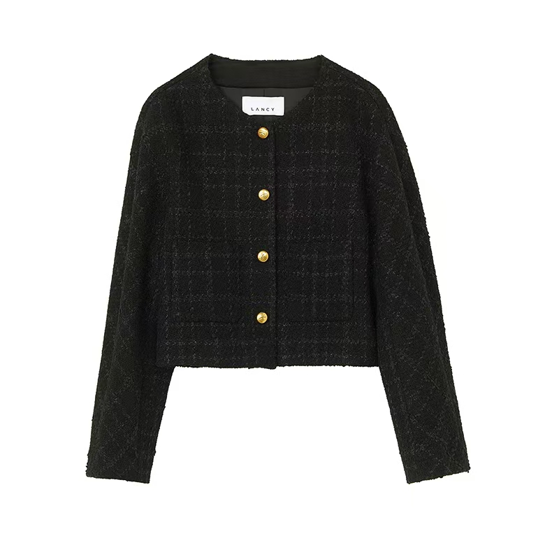 朗姿高级黑色羊毛圆领百搭通勤上衣