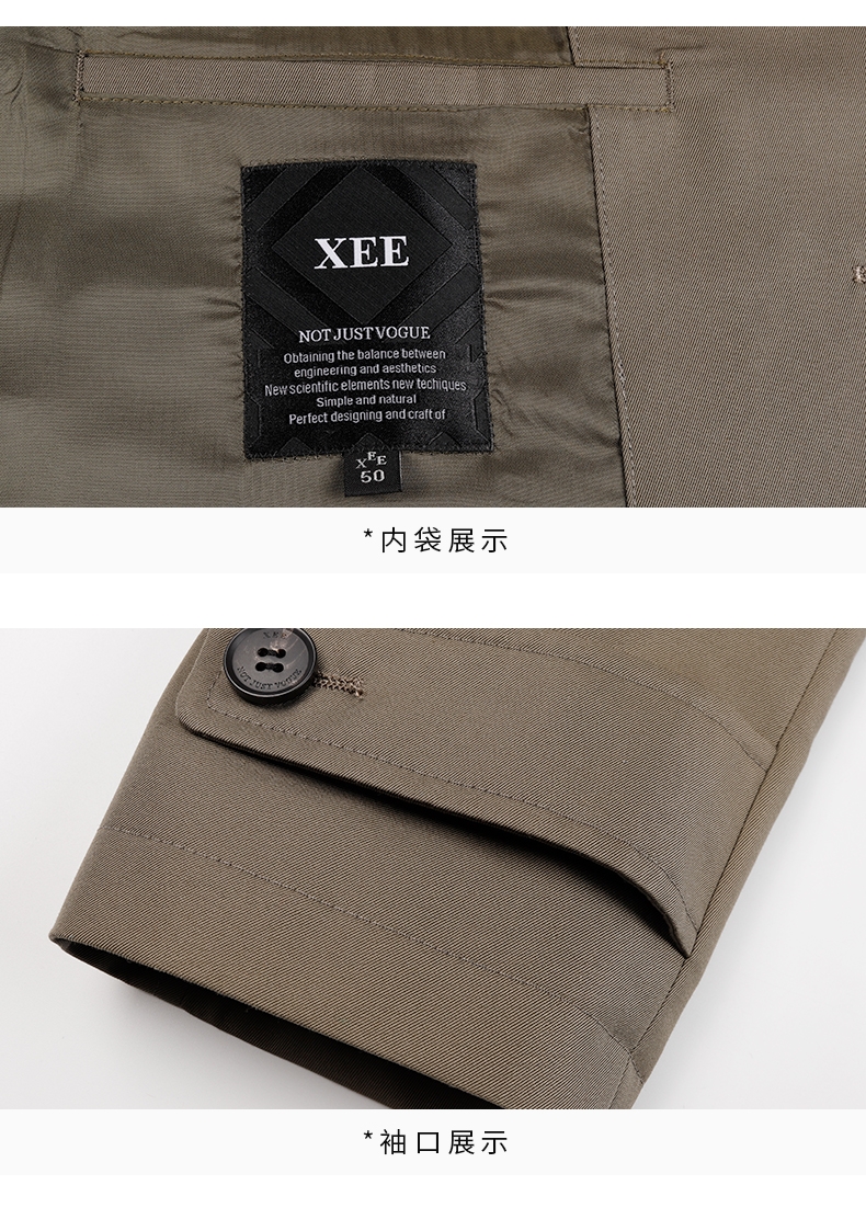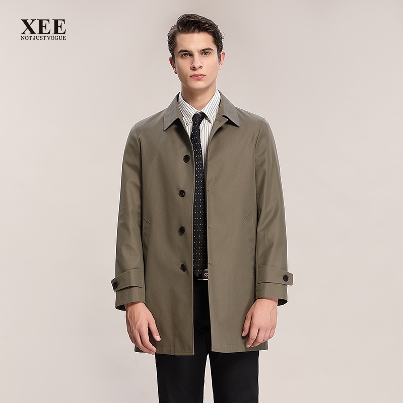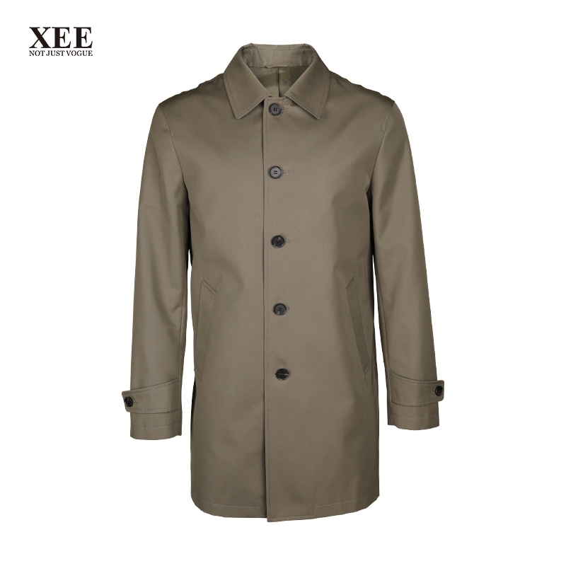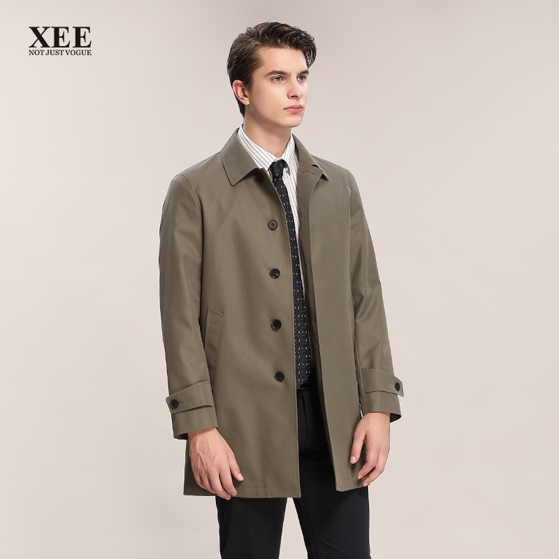 XEE商场同款男士春季灰绿色单排扣翻领时尚都市中长款风衣外套