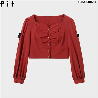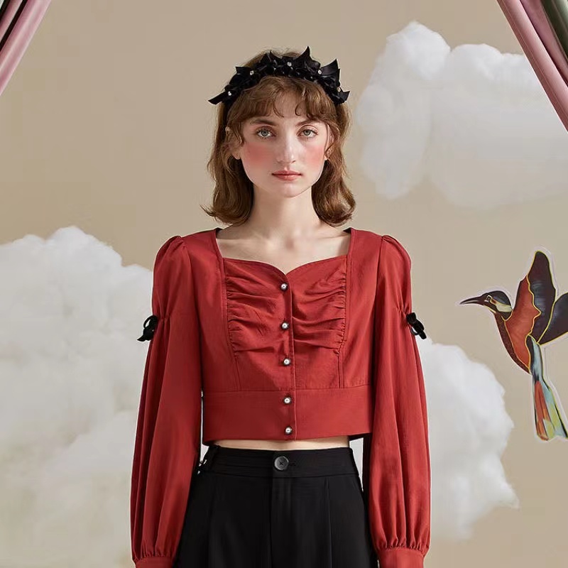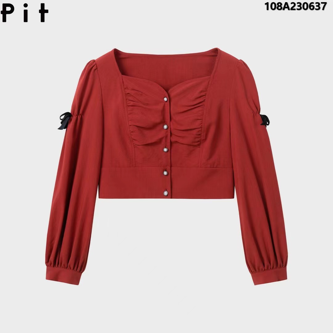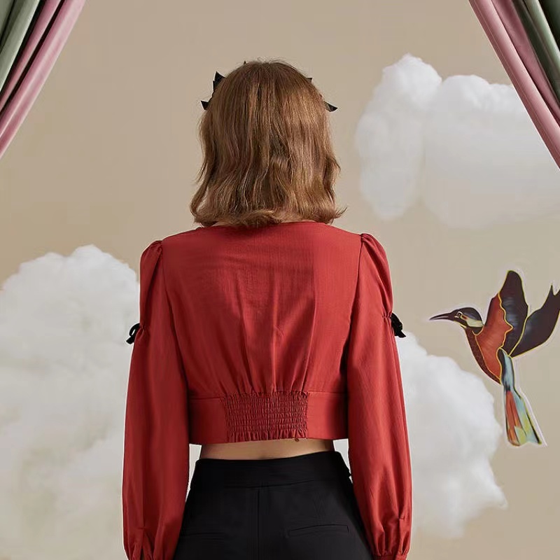 >>PIT法式复古方领设计感砖红色短上衣