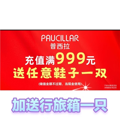 普西拉充值999元送任意鞋子一双,加送行旅箱一只