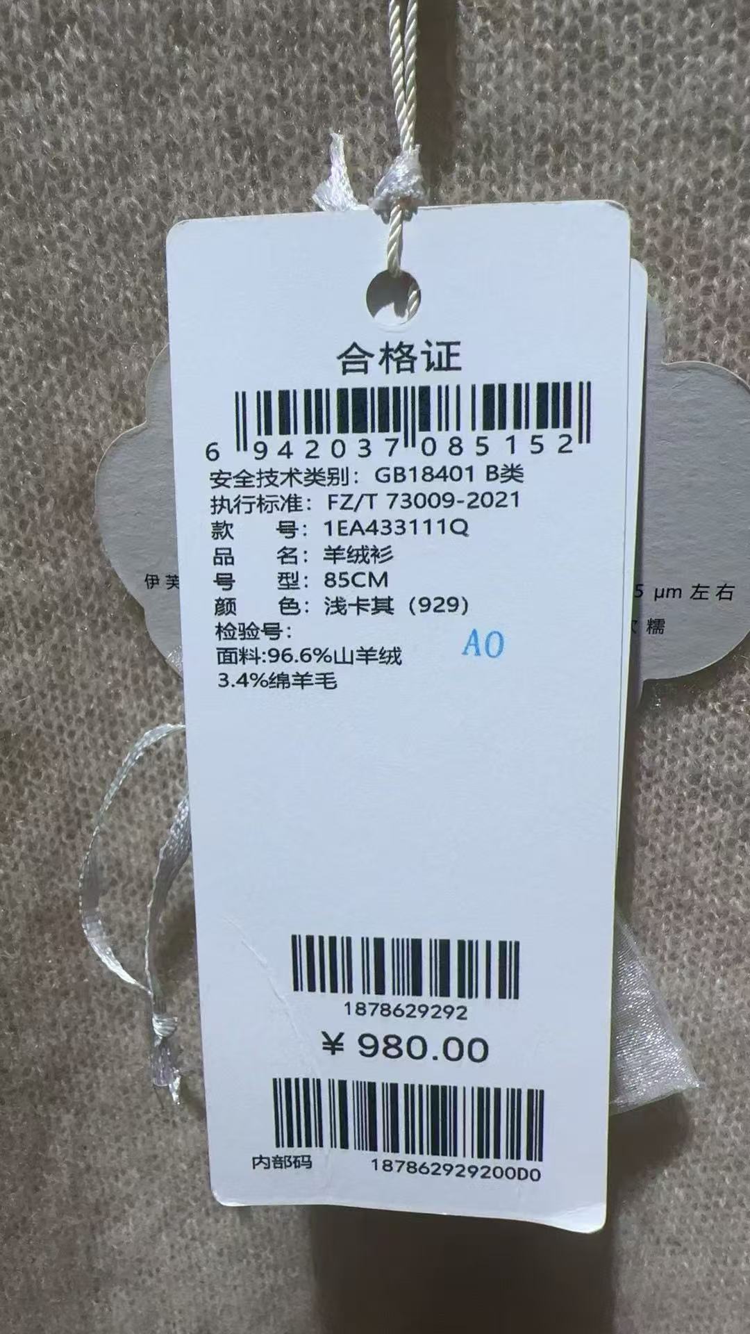 面料:96.6%山羊绒,3.4%绵羊毛 原价:980,一口价:490.