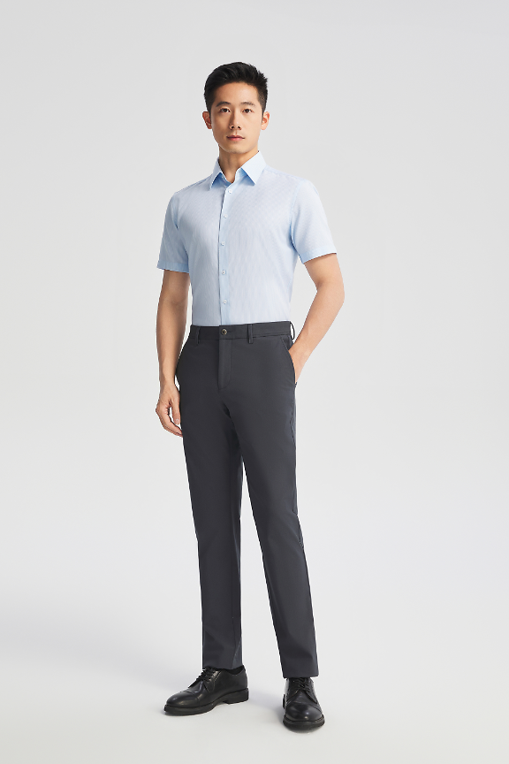 雅戈尔DP免烫衬衫,灰蓝色细格纹,100%强念的纱线手感细腻,亲肤透气,挺括有型,精神干练十足