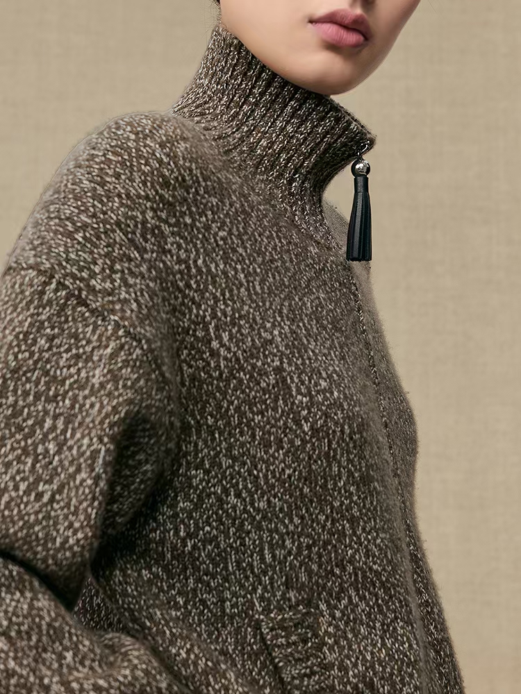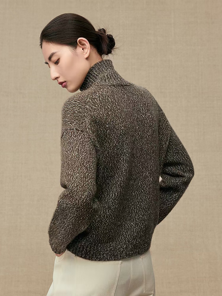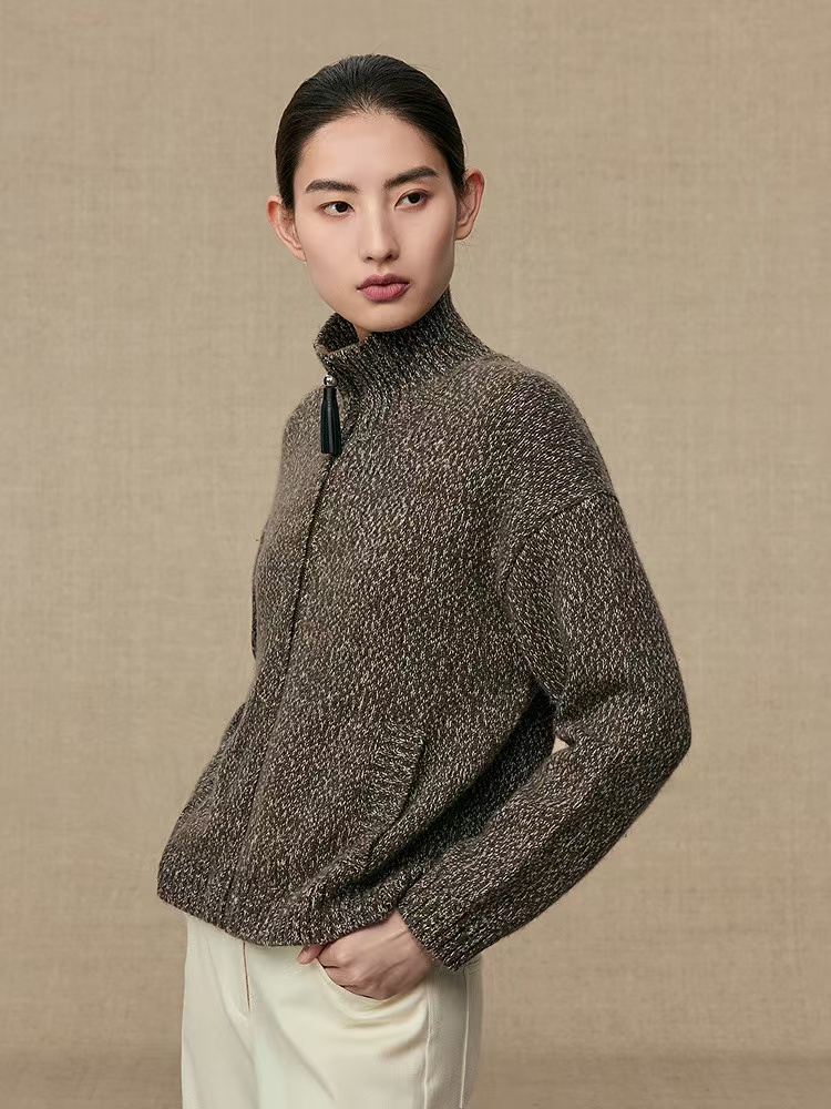 品名:鄂尔多斯1980毛绒夹花高领女开衫 成分:68%绵羊毛30%山羊绒2%锦纶 |