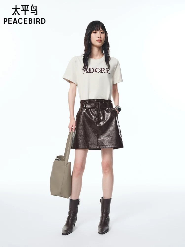 太平鸟摩登短宽腰带设计PU皮A字半裙