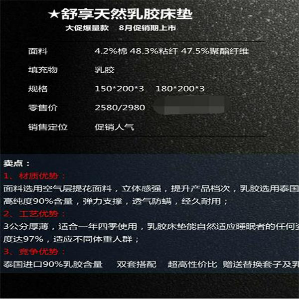 规格:180*200*3填充:泰国天然乳胶90%含量。弹力支撑,透气防螨,经久耐用。