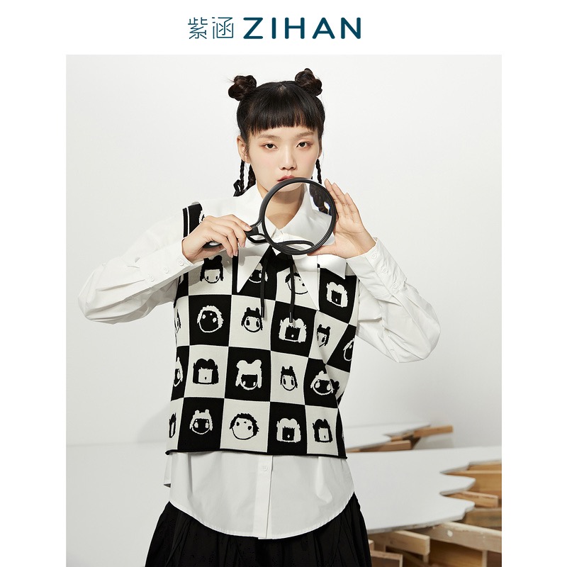 紫涵2021秋装新款棋盘格V领针织衫马甲背心