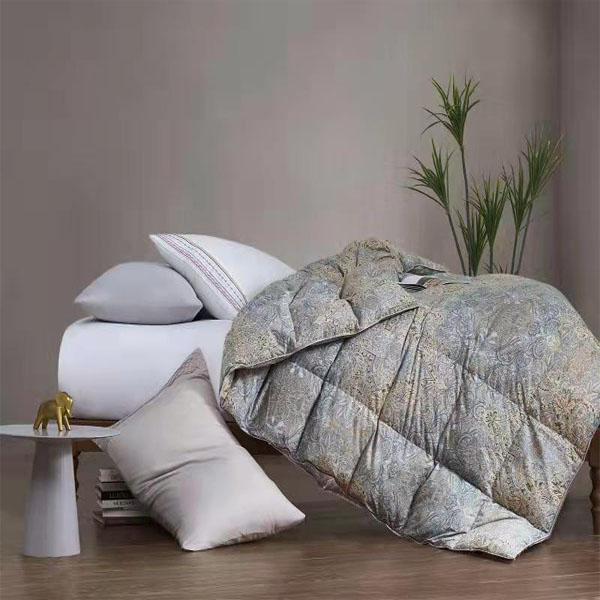 抗菌白鹅绒填充,绒子含量95%,T4级填充量,适合0-8℃卧室环境。 羽绒被特制的专业防绒面料,既保持全棉的顺滑亲肤,又强化了防绒耐磨能力;优雅的灰蓝色调与对称的藤蔓花叶纹样,整体视觉干净又清新。