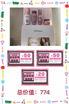护肤>>雪花秀(润燥价值143,水价值56,精华价值168,霜价值108,玉石手护价值179,两张50元现金券一张20元现金券)