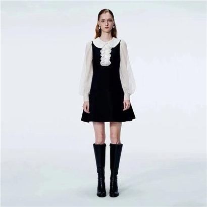 淑女装>>JORYA卓雅2021秋冬新款娃娃领蕾丝拼接网纱长袖连衣裙