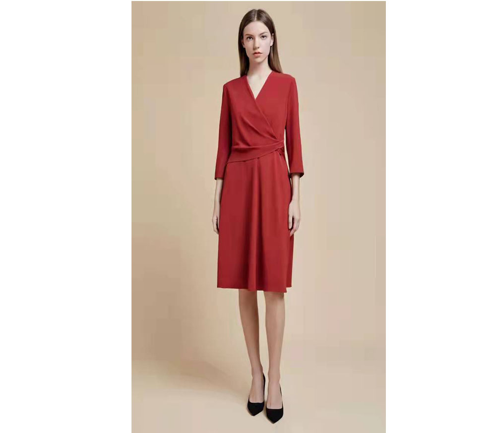 V领设计轻松打造修长脖颈线条,前胸不对称垂荡扭结、小A裙摆修饰腰身的同时又极 具设计感,七分袖的设计随心搭配珠宝腕表,打造精致迷人Look。