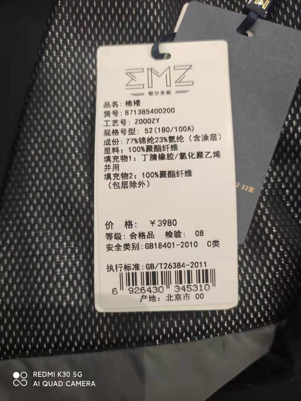 EMZ鄂尔多斯棉袄经典黑色款,干练大方,一体帽兜领设计,简约又不失时尚