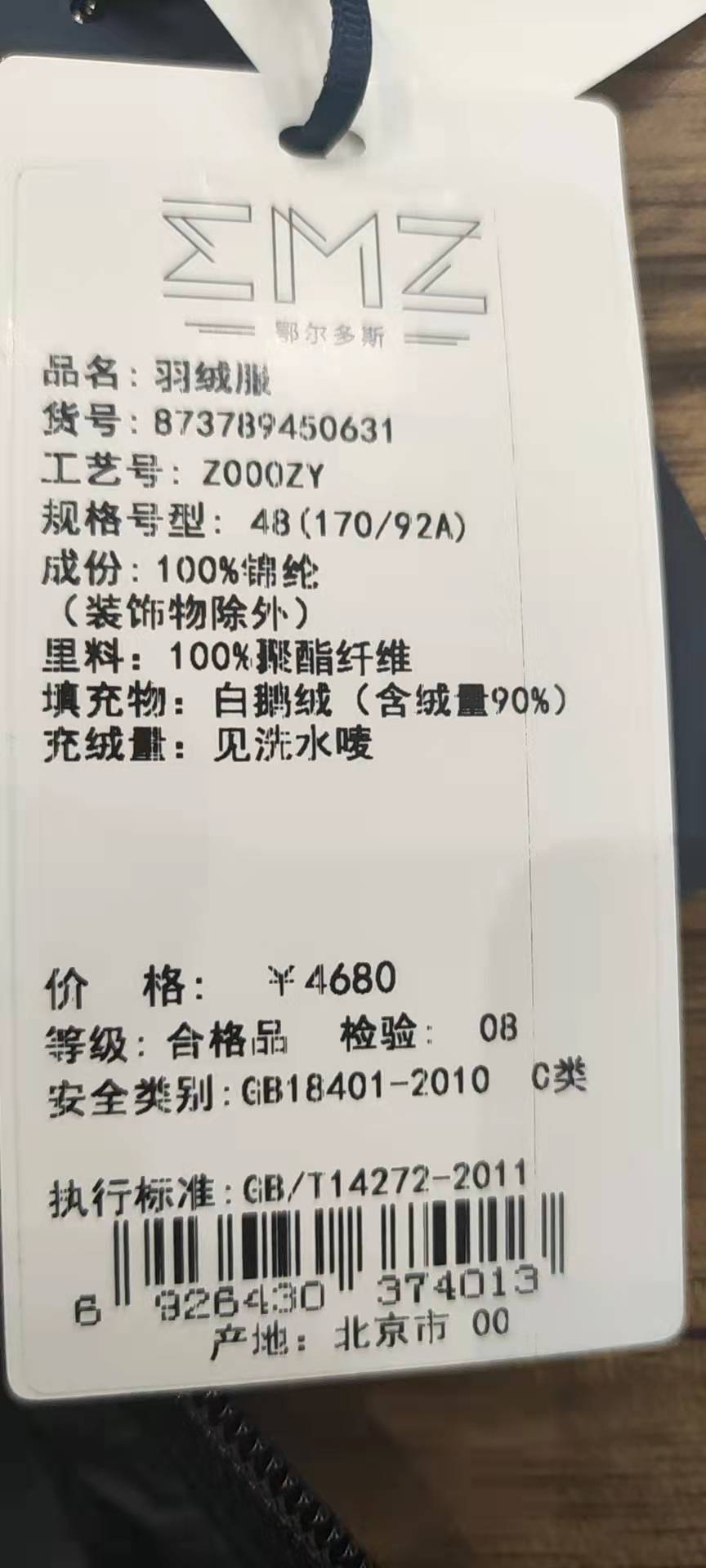 EMZ鄂尔多斯鹅绒服,采用西伯利亚白鹅绒,特别的轻薄柔暖,属于0克重,特别舒适,温暖的同时又有型