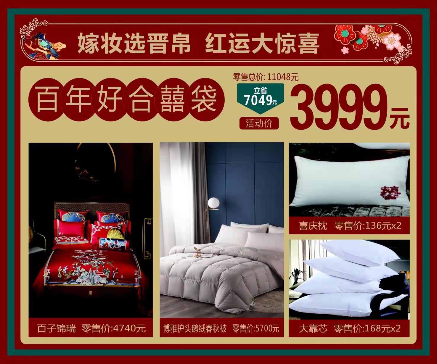 婚庆套餐礼包:百子锦瑞六件套1套,博雅护头鹅绒春秋被1条,送60*80靠芯2只,枕芯2只,规格220*240