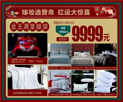 婚庆套餐礼包:宫囍 恭囍.龙凤贺囍十件套1套,罗曼时光四件套1套,阳光海岸四件套1套,布达佩斯鹅绒四季被1条,贡品养颜蚕丝被1条,百子招财喜被1条。送60*80靠芯2只,枕芯2只,规格220*240