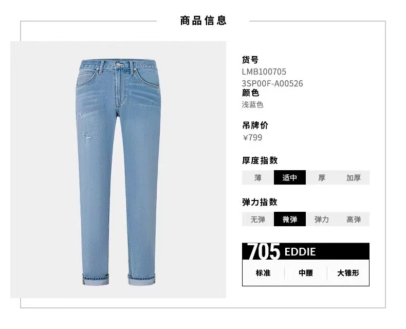 >>Lee22春季新品705标准中腰蓝色男牛仔裤LMB1007053SP00F-A00526