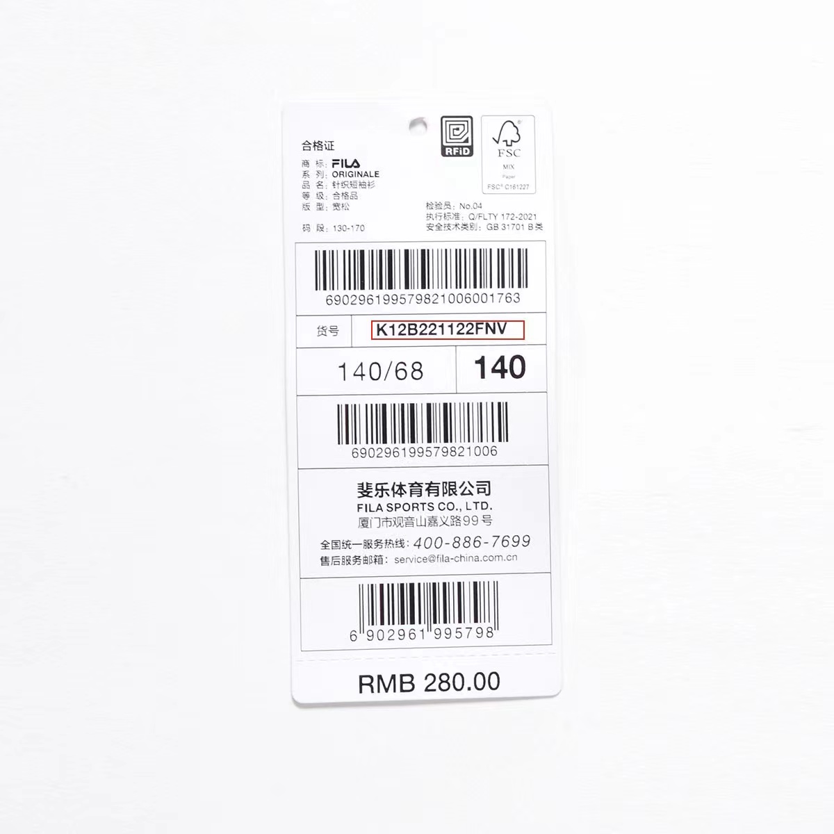 斐乐儿童短袖T尺码130-170