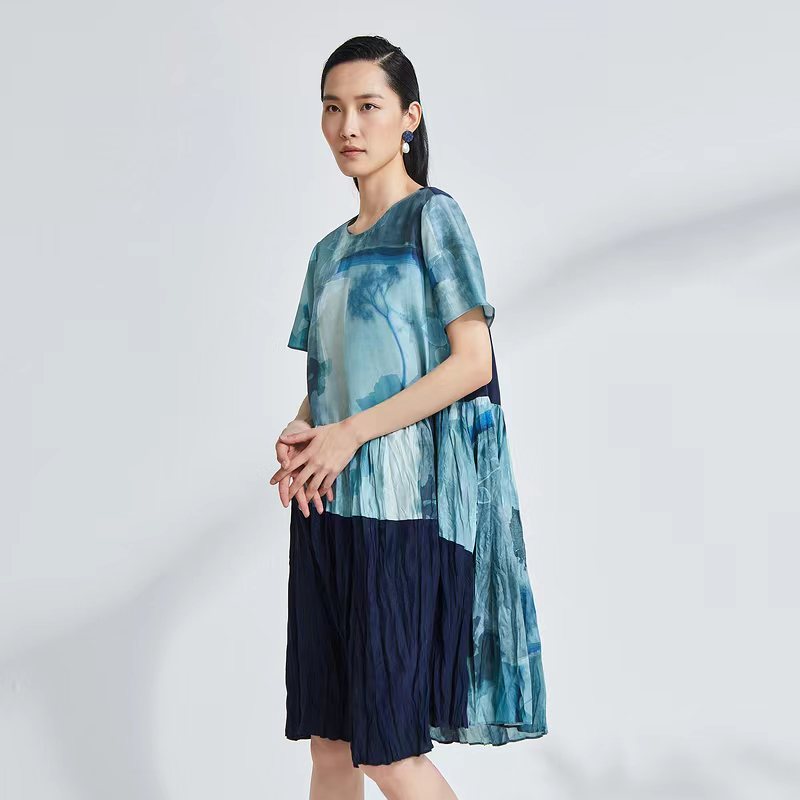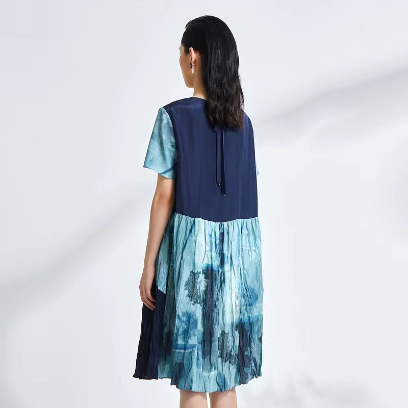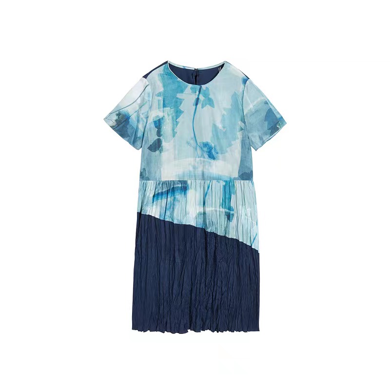 >>OTT服饰2021夏拼接压皱印花连衣裙