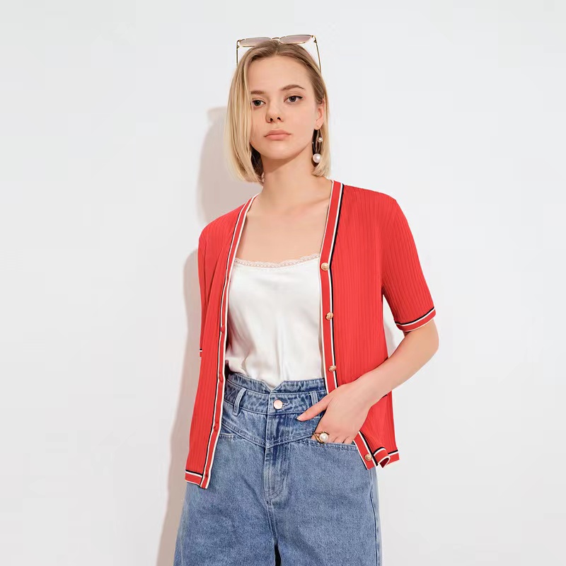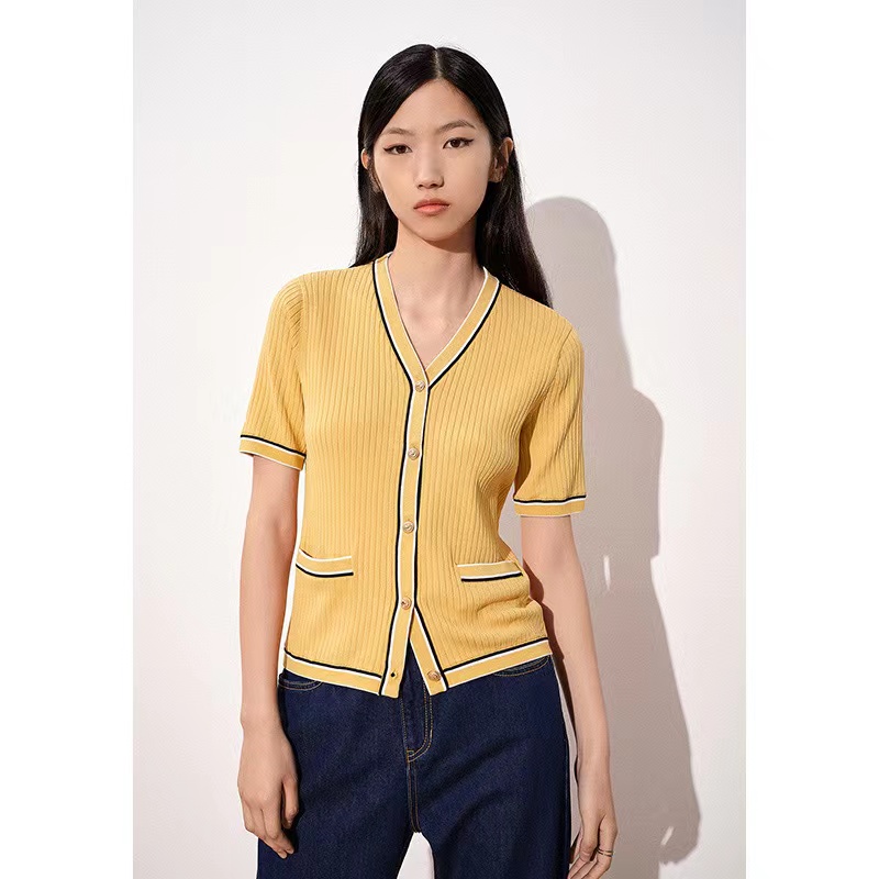 >>诗篇女装夏季简约V领时尚条纹针织衫