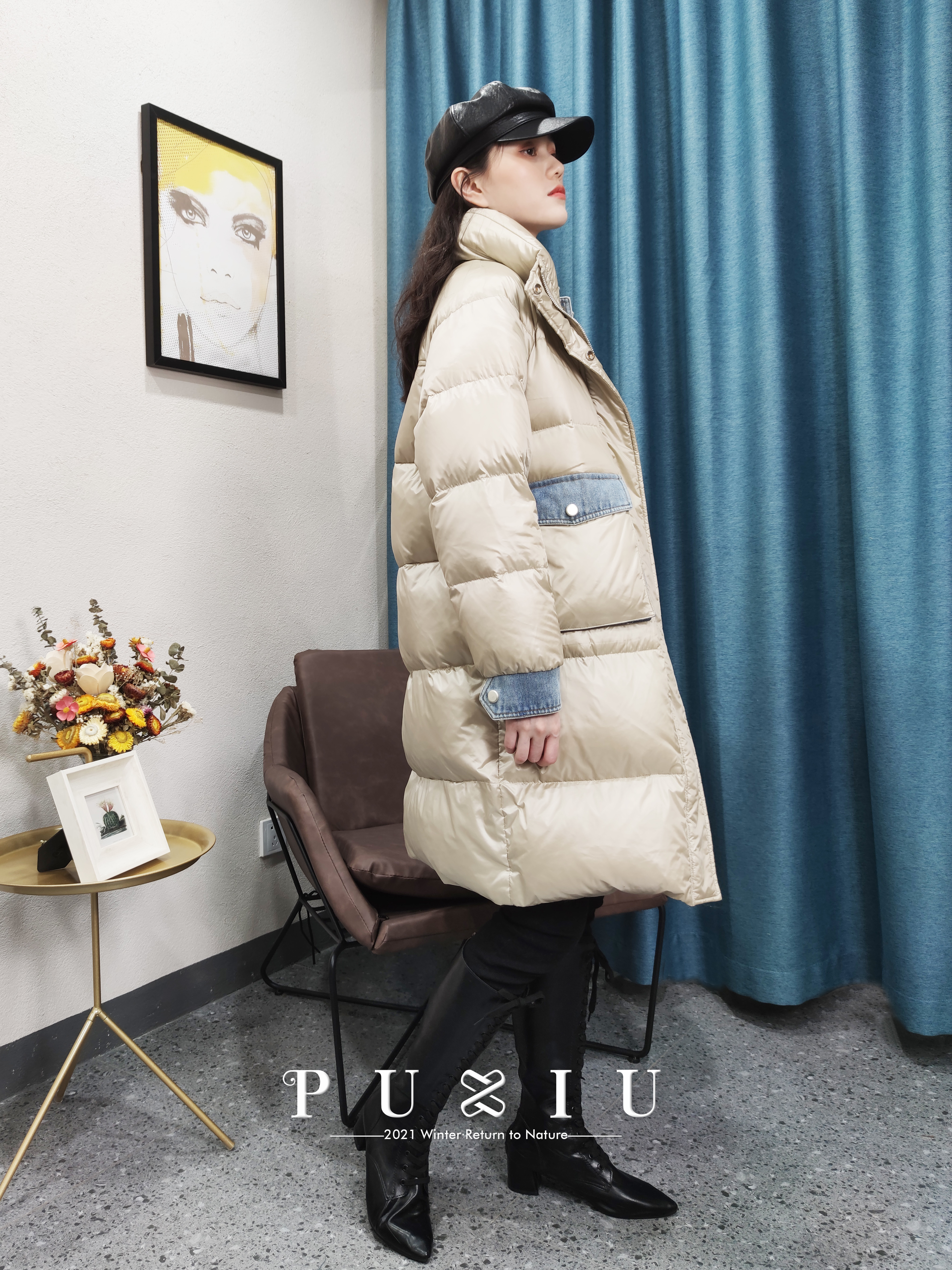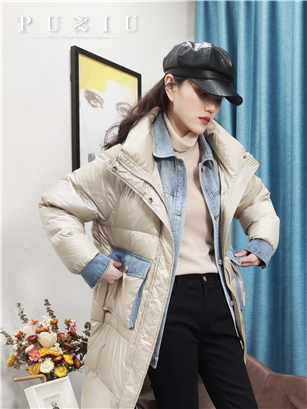 璞秀2021冬反季假两件牛仔 拼接羽绒服