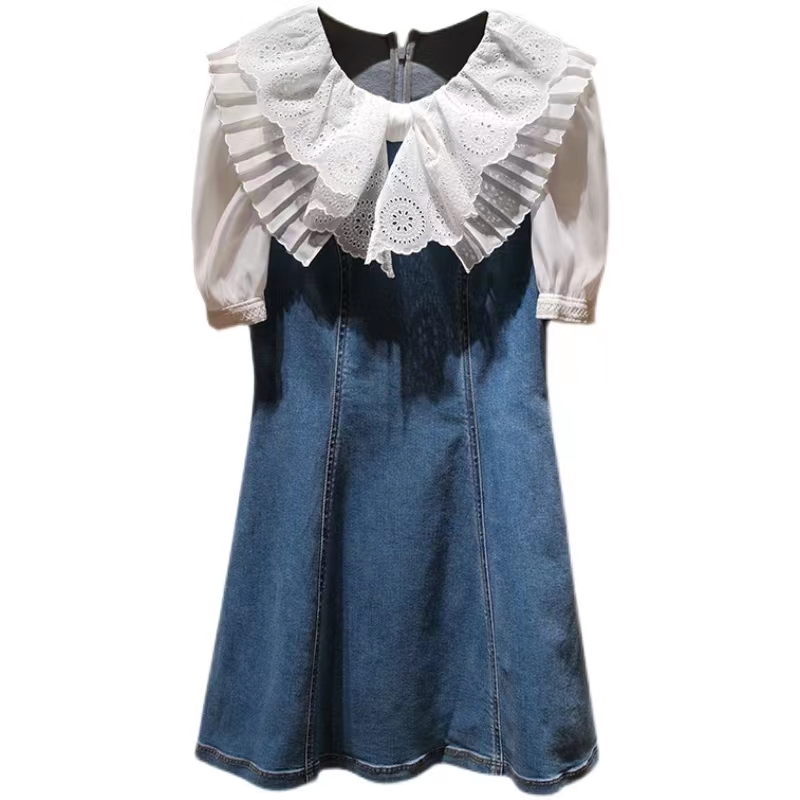 淑女装>>JORYA2022夏季新款压褶花边娃娃领网纱拼接水洗牛仔高腰A字连衣裙