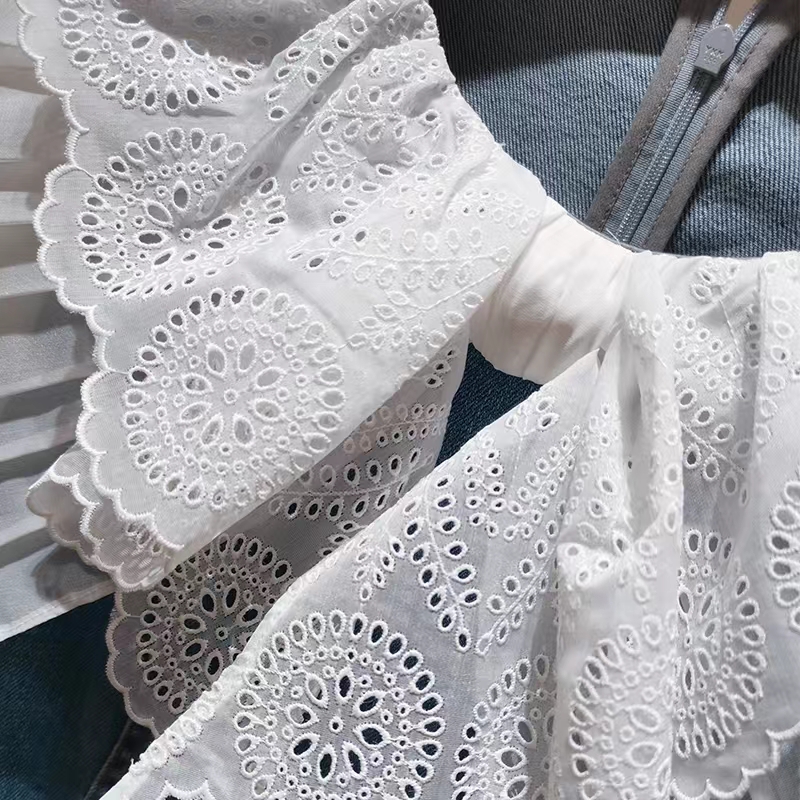 JORYA2022夏季新款压褶花边娃娃领网纱拼接水洗牛仔高腰A字连衣裙