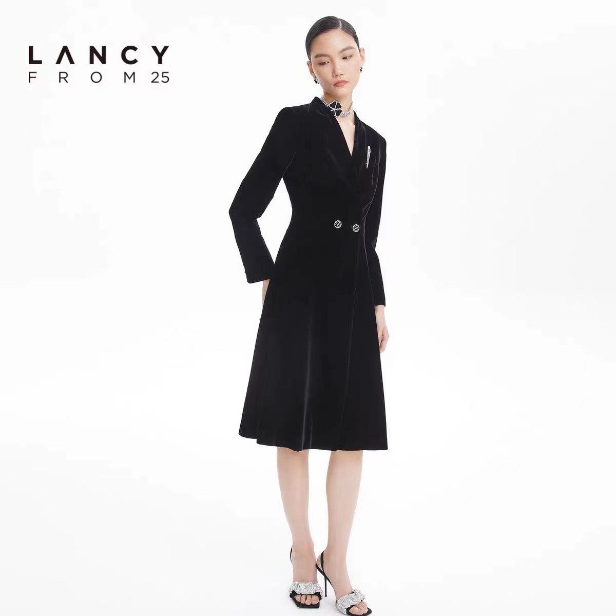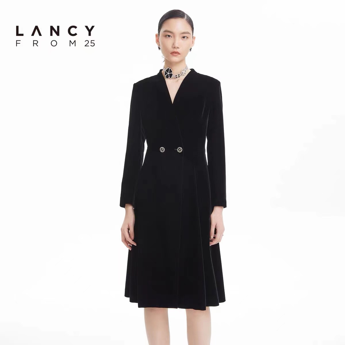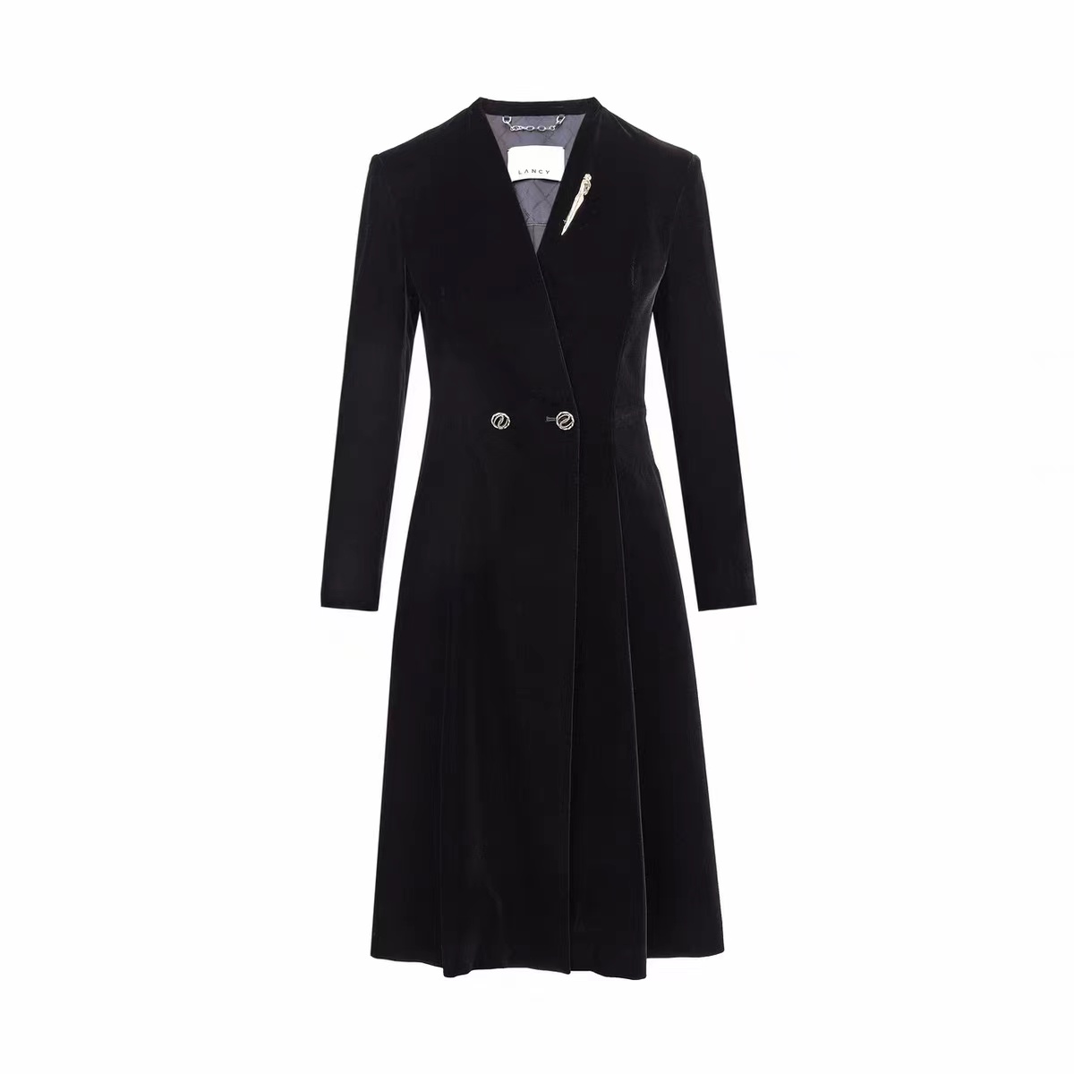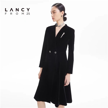 淑女装>>LANCY/朗姿2022秋季新款丝绒中长款风衣女修身大衣收腰高级感外套