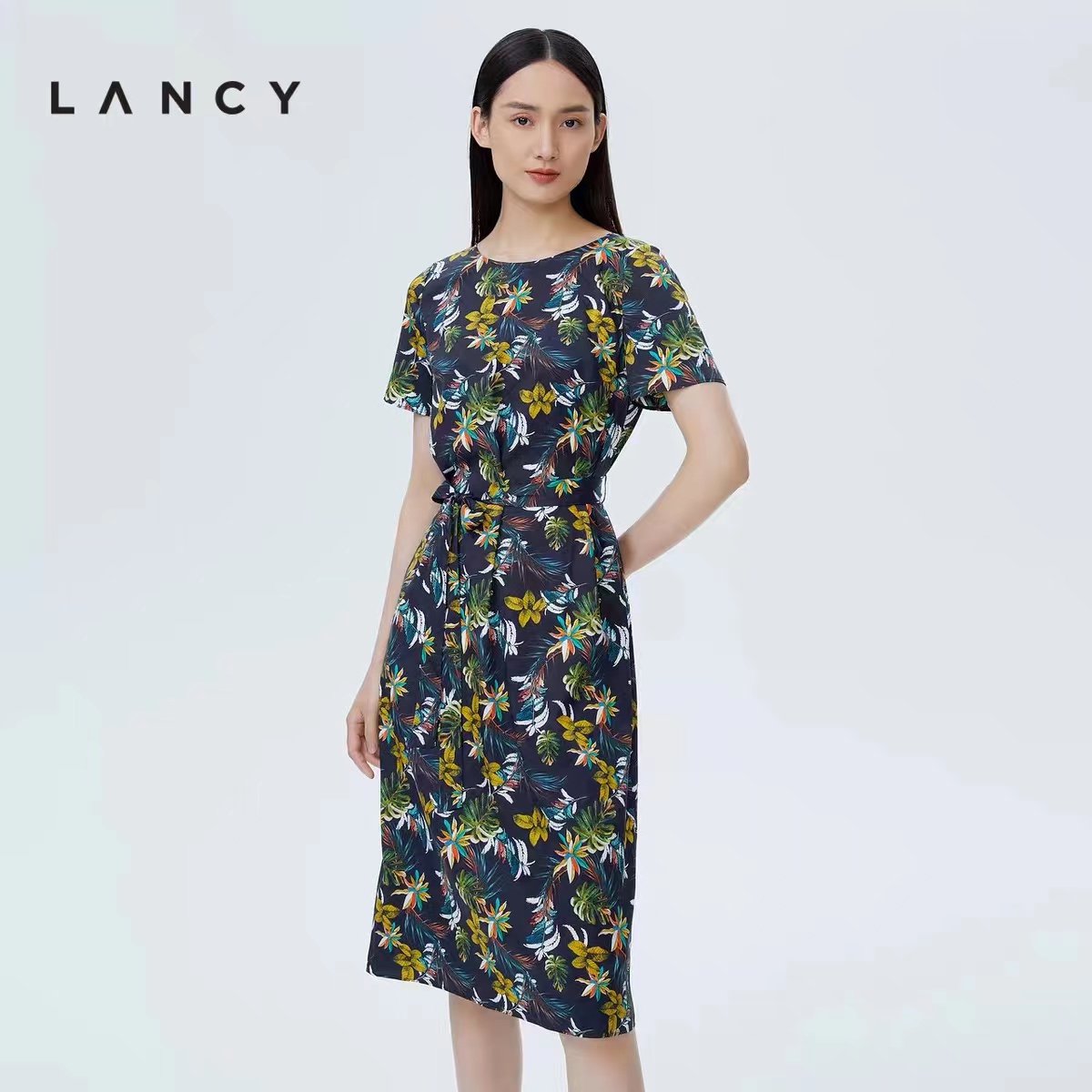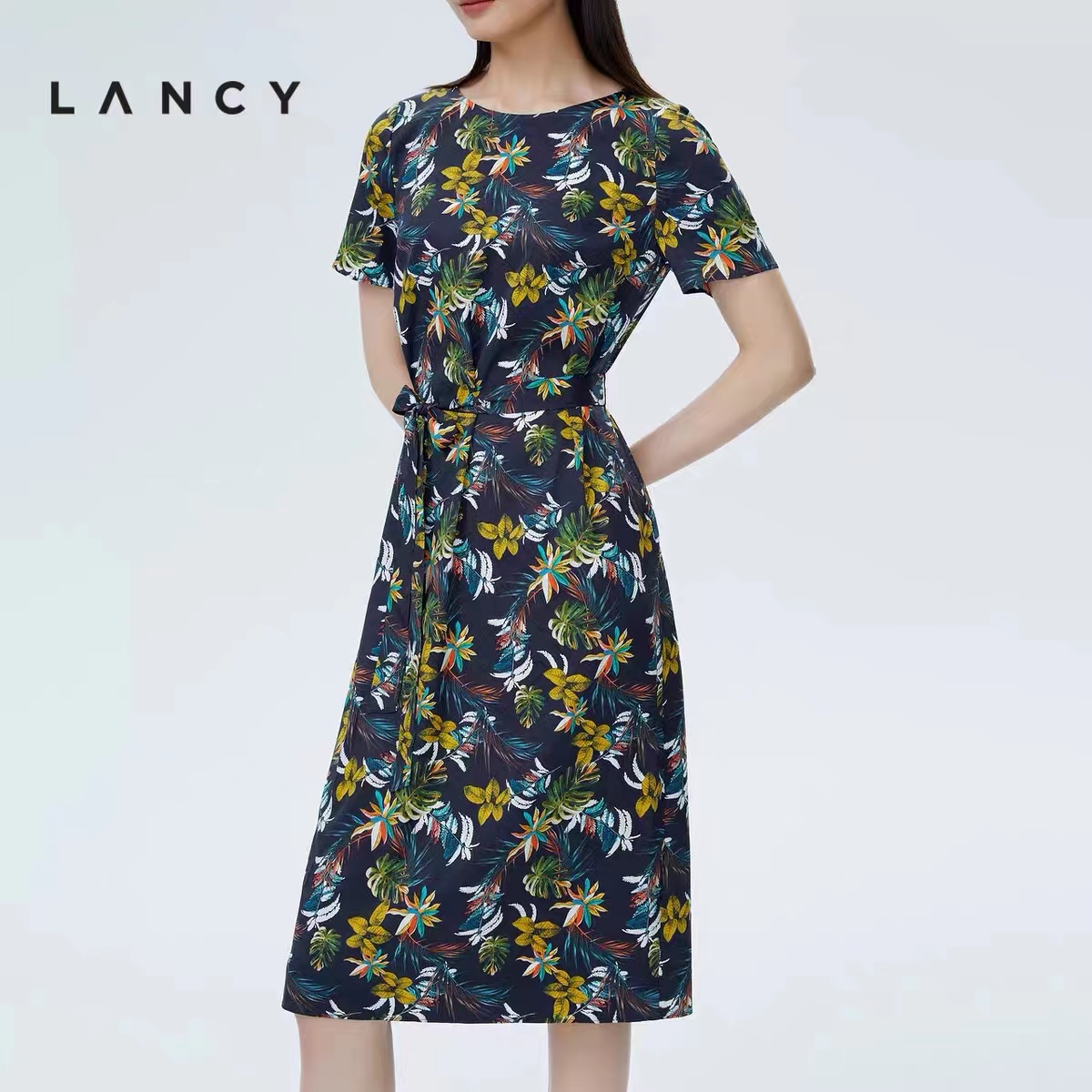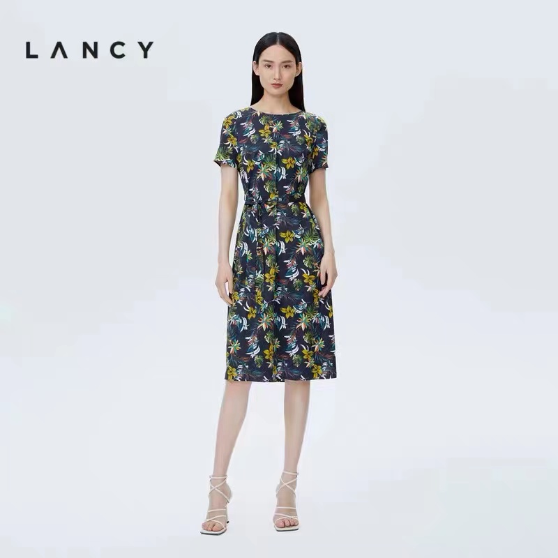 LANCY/朗姿女2022夏新款短袖真丝印花收腰通勤连衣裙子商场同款