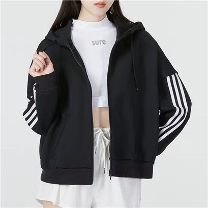 >>阿迪达斯运动外套女装2022冬季新款黑色连帽开衫针织夹克女HM7046