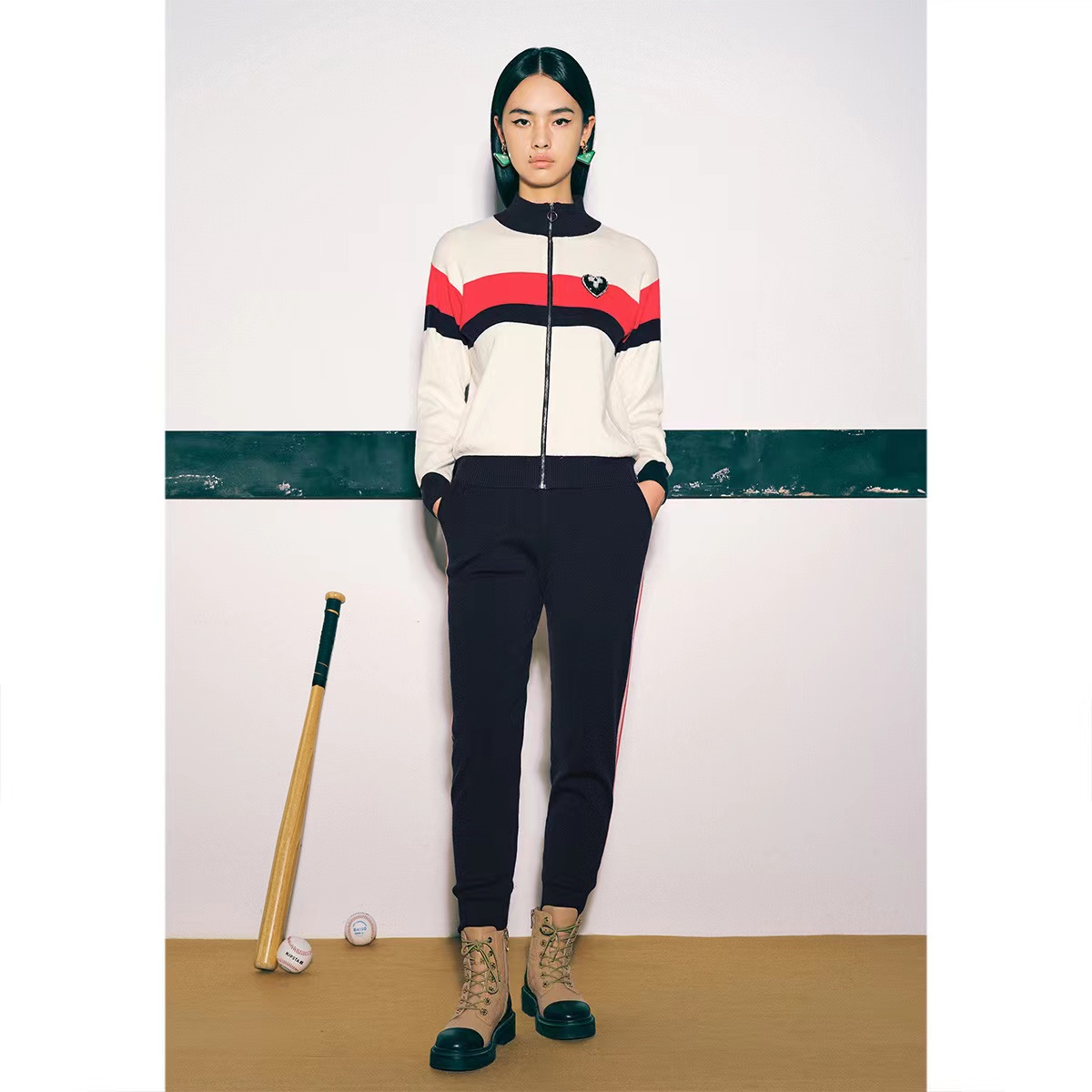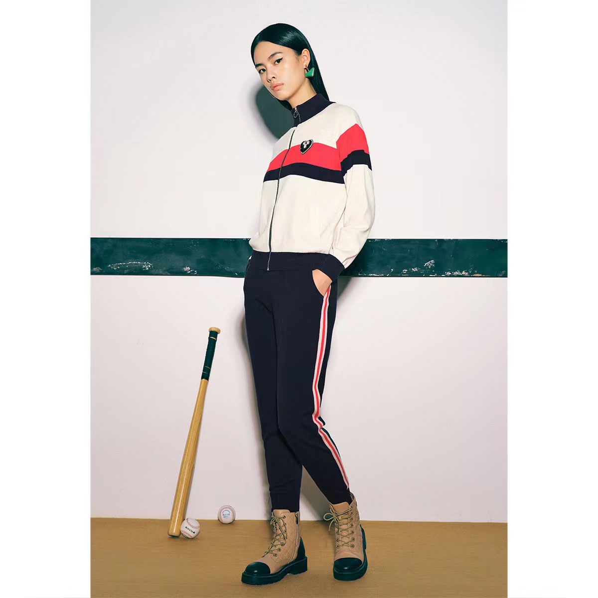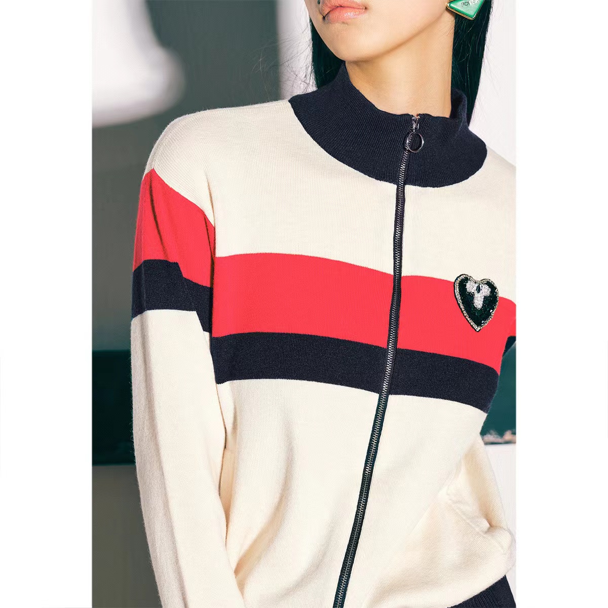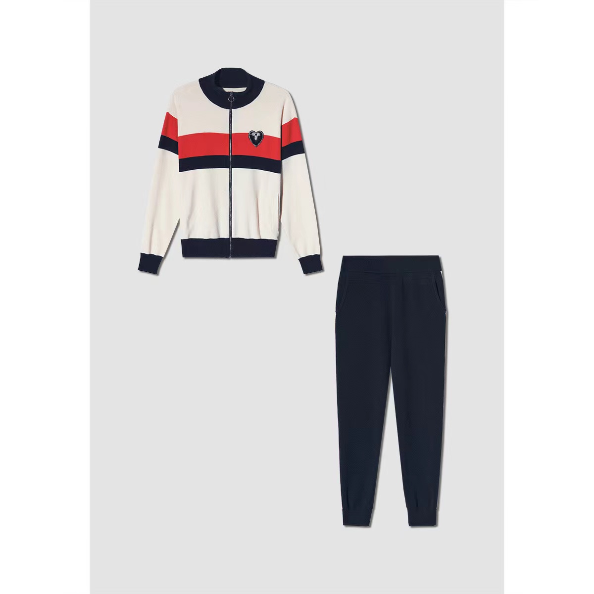 诗篇女装新款减龄条纹拉链开衫针织衫休闲裤运动套装