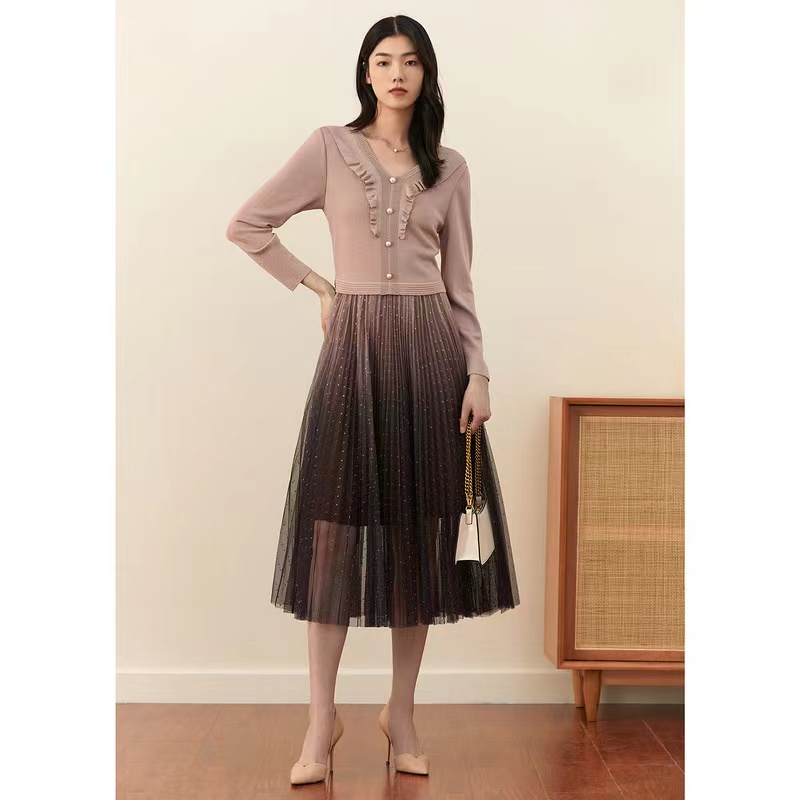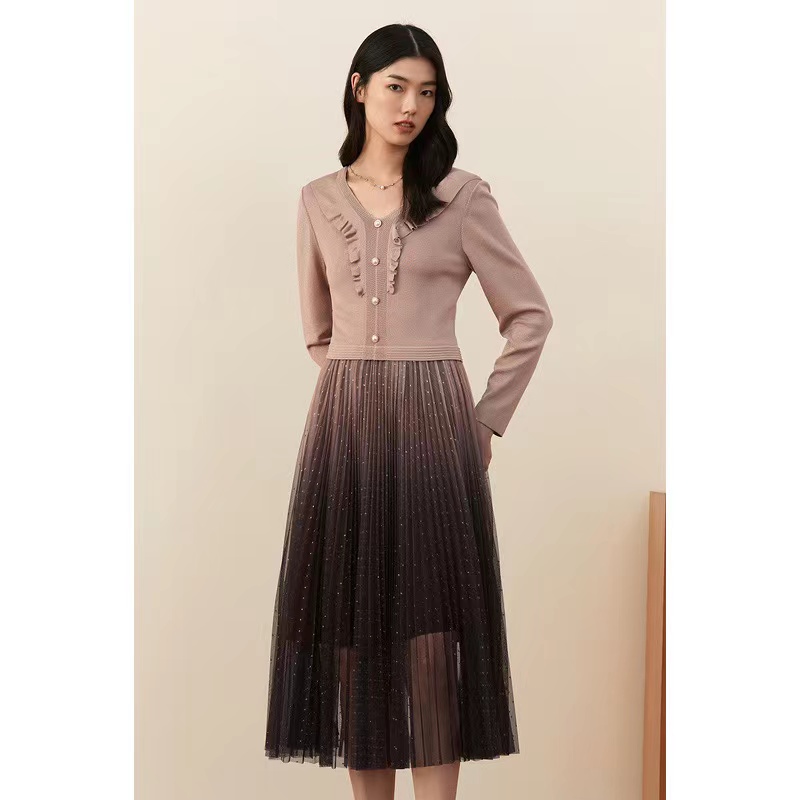 >>YINER音儿女装新款拼接网纱收腰连衣裙