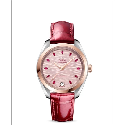 海马系列Aqua Terra34毫米女士腕表,型号22023342060001,淡粉色表盘浮雕有波浪图案,配备榄尖型切割红宝石小时刻度,搭配红色皮表带,尽显璀璨