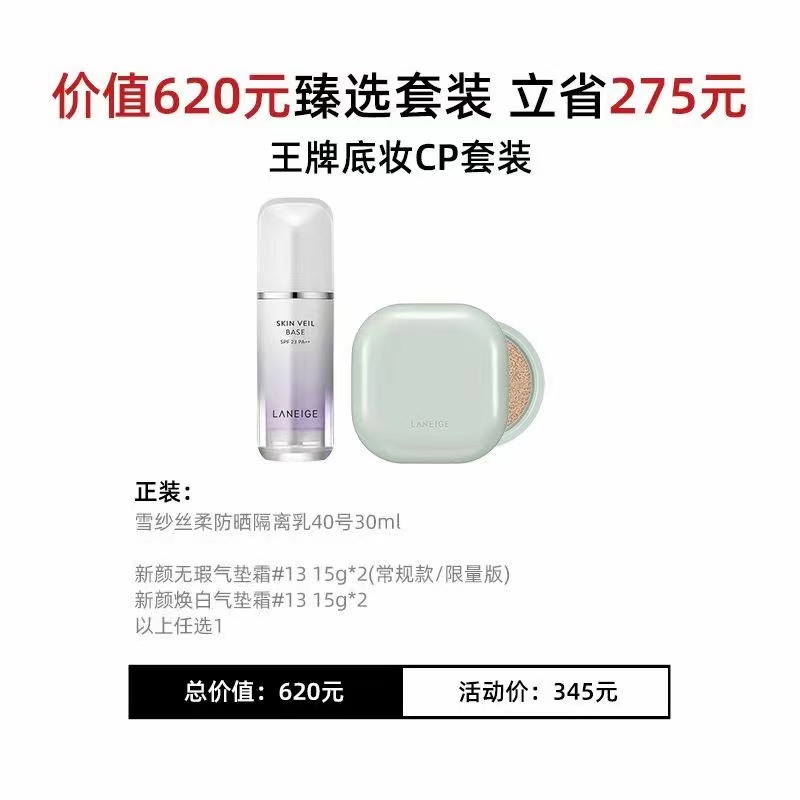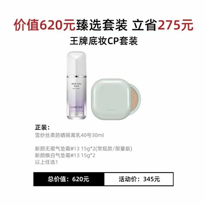 兰芝底妆王牌CP,隔离提亮肤色,气垫均匀肤色。