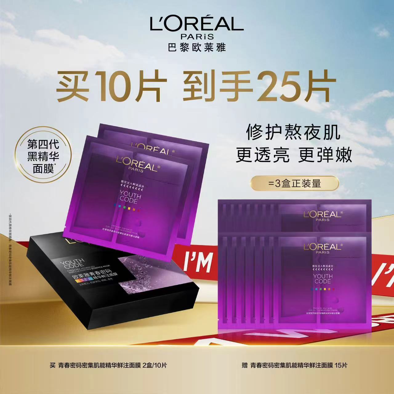 欧莱雅复颜玻尿酸水光充盈导面膜2盒(买10片得25片)相当于4折