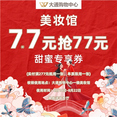 美妆馆7.7元抢77元甜蜜七夕专享券